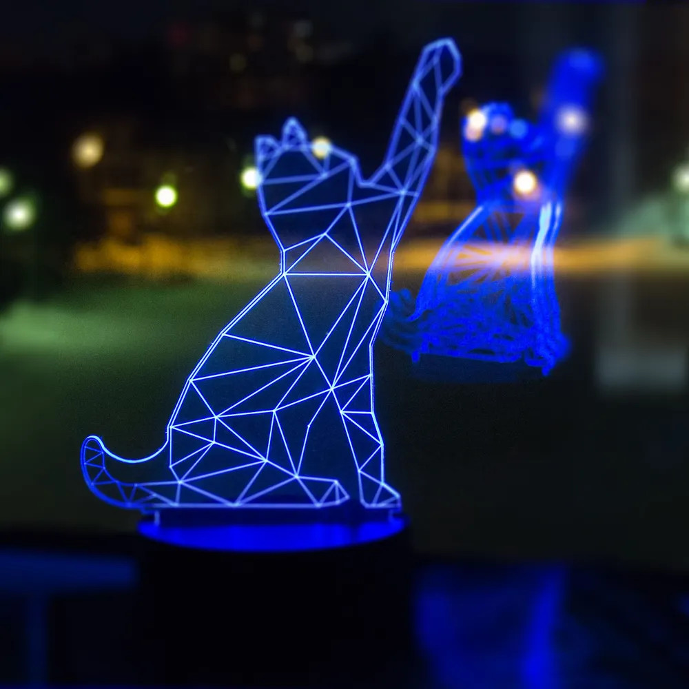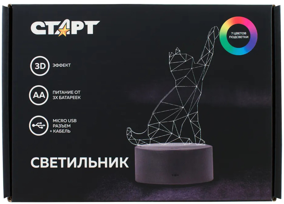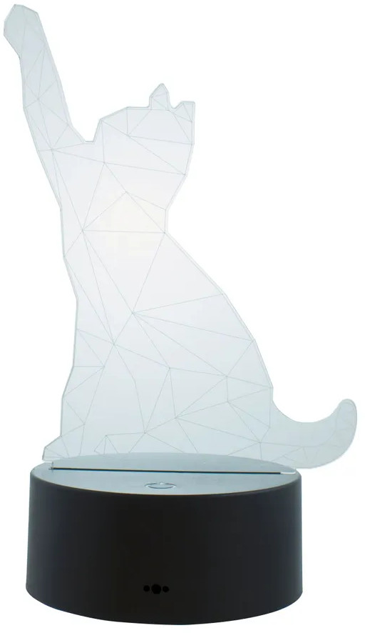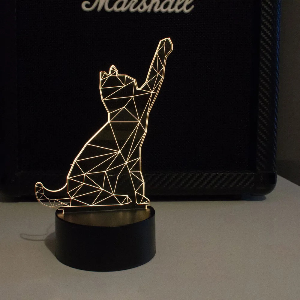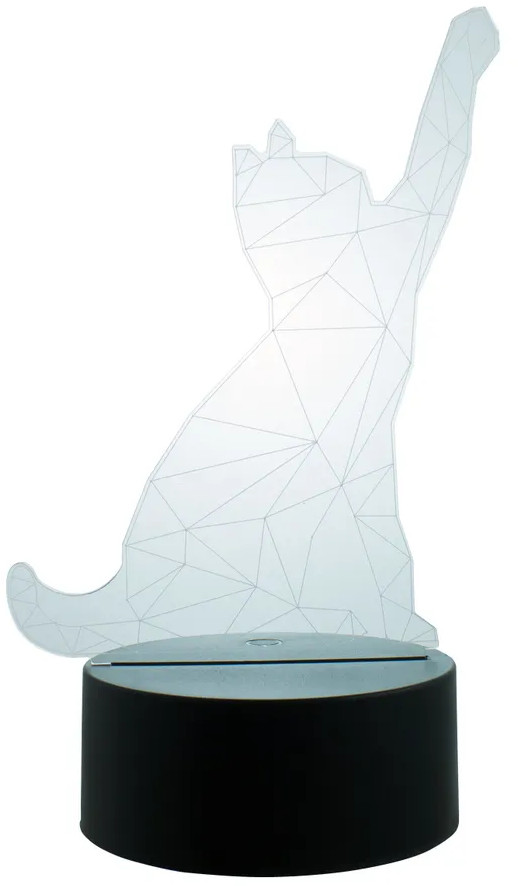 При включении этого миниатюрного 3D светильника из темноты возникает завораживающее объёмное изображение игривой кошки с поднятой лапкой. 3D-картинка переливается разными оттенками. Семь цветов свечения переключаются сенсорной кнопкой, расположенной на округлом основании. Имеется и автоматический режим, при активации которого цвета начнут перетекать друг в друга непрерывно. Это настоящий подарок тем, кто боится темноты. Особенно — маленьким детям. Лёгкое свечение не побеспокоит ночной сон. Великолепно смотрится как самостоятельный элемент декора. Прекрасен в качестве подарка.