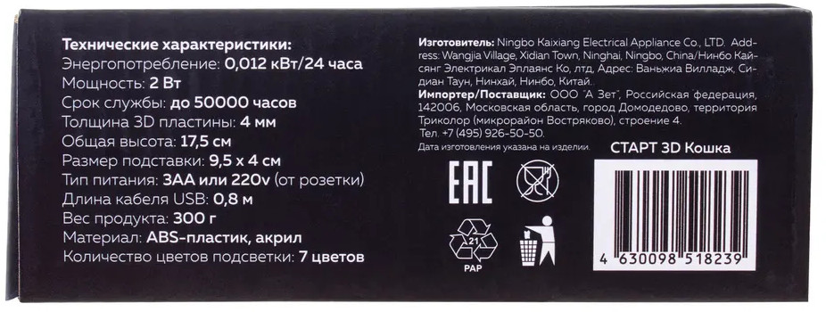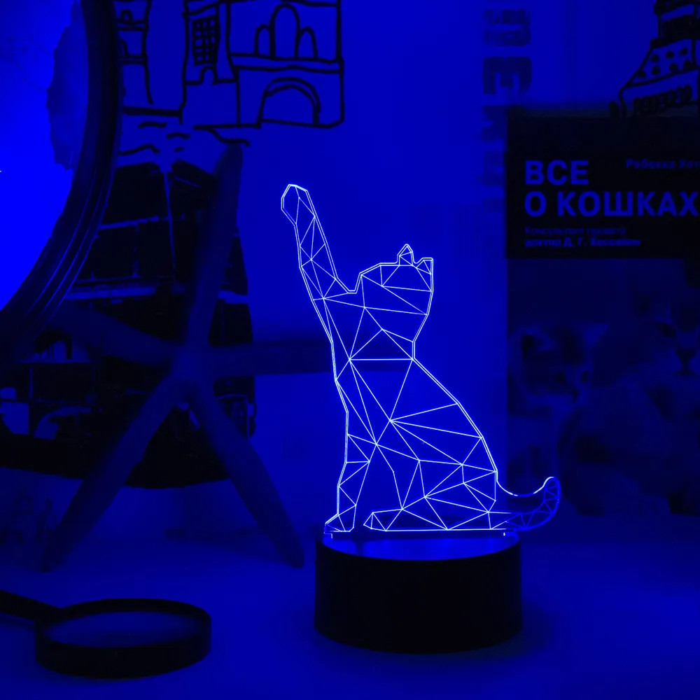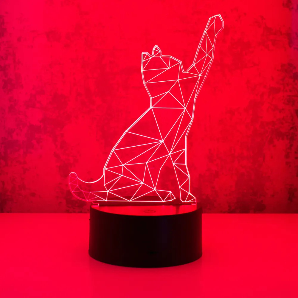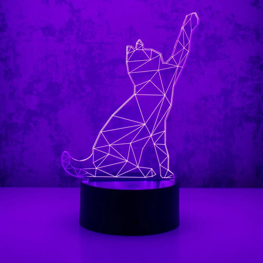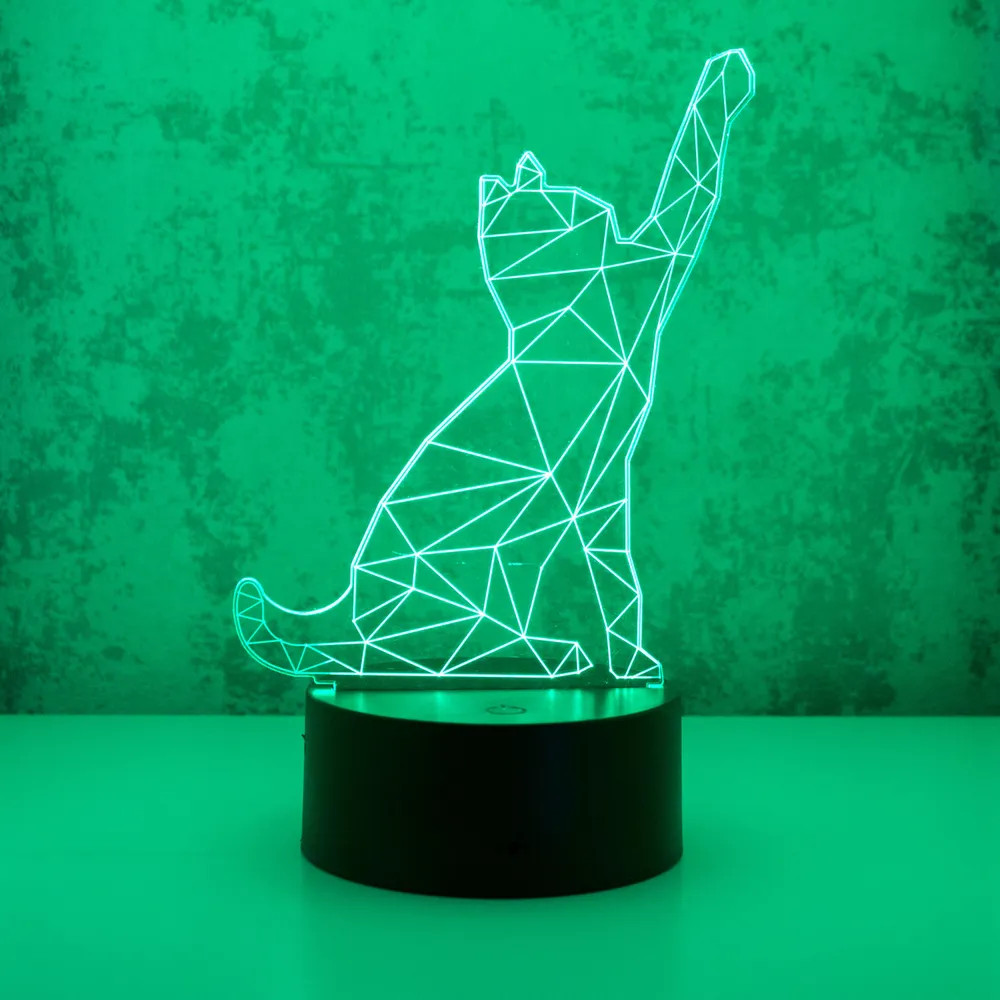 При включении этого миниатюрного 3D светильника из темноты возникает завораживающее объёмное изображение игривой кошки с поднятой лапкой. 3D-картинка переливается разными оттенками. Семь цветов свечения переключаются сенсорной кнопкой, расположенной на округлом основании. Имеется и автоматический режим, при активации которого цвета начнут перетекать друг в друга непрерывно. Это настоящий подарок тем, кто боится темноты. Особенно — маленьким детям. Лёгкое свечение не побеспокоит ночной сон. Великолепно смотрится как самостоятельный элемент декора. Прекрасен в качестве подарка.