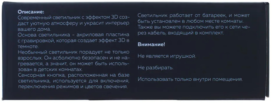 Светильник можно подключать к USB портам ваших компьютеров и ноутбуков. Ночник может работать и от обычных батареек (3 шт. x ААА, в комплект не входят). Это позволяет разместить его в любом удобном для вас месте. Светильник экономичен — в приборе используются светодиоды, потребляющие минимальное количество электроэнергии. Они прослужат долго — способны непрерывно работать до 50000 часов. 3D-светильник изготовлен из нетоксичных ABS пластика и акрила. Это абсолютно безопасные материалы для здоровья человека и экологии. Светодиоды не нагревают корпус.