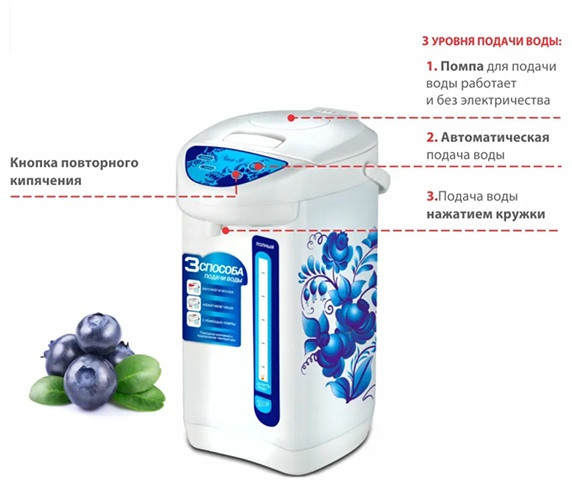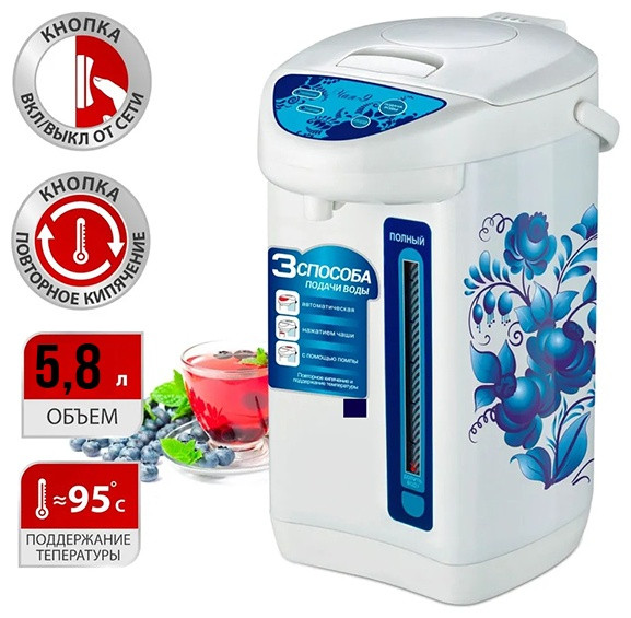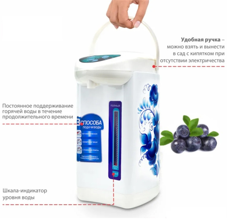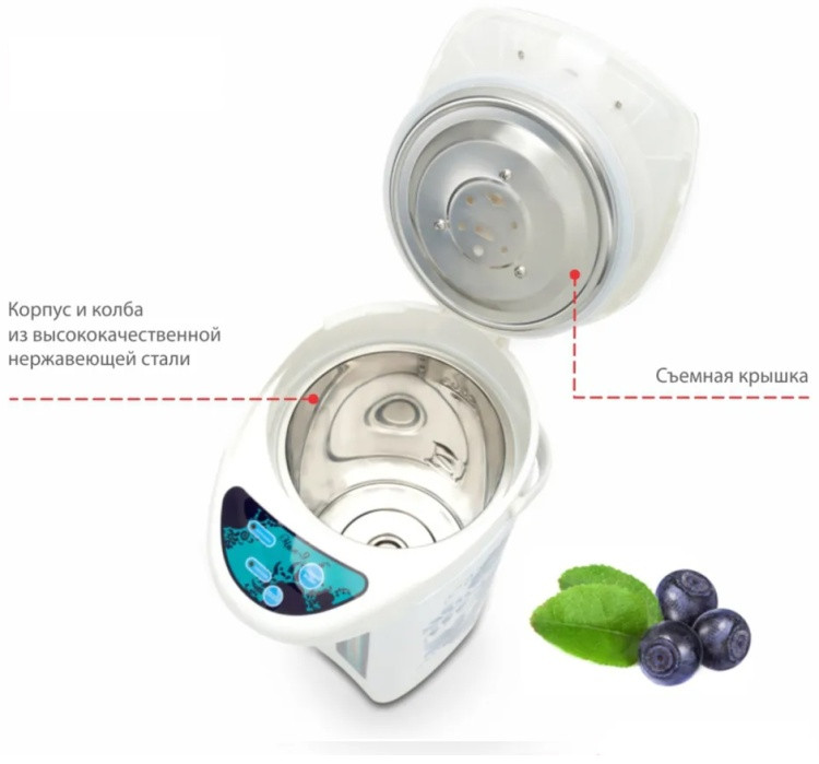 Gipfel Термопот WL-0705В данный момент этот товар отсутствует в продаже. Возможно, у нас найдется аналогичный или похожий товар здесь. Термопот — это многофункциональный электрический прибор, который объединяет функции кулера, чайника и термоса. Он доводит воду до кипения и сохраняет ее горячей. Прибор одинаково удобен для домашнего применения и для использования в небольших офисах, где чай или кофе пьют часто, а тратить время на кипячение некогда. Также термопот идеально подходит для семей с маленькими детьми: можно быстро приготовить молочную смесь или кашу. Устройство работает очень просто. Нужно залить колбу водой, закрыть крышкой и включить. Для кипячения воды используется ТЭН. Когда достигается нужная температура, срабатывает термовыключатель. Процесс подогрева останавливается, а градус сохраняется в емкости за счет теплоизоляционного покрытия. Когда он начинает снижаться, нагревательный прибор снова включается, чтобы удержать заданную температуру. |