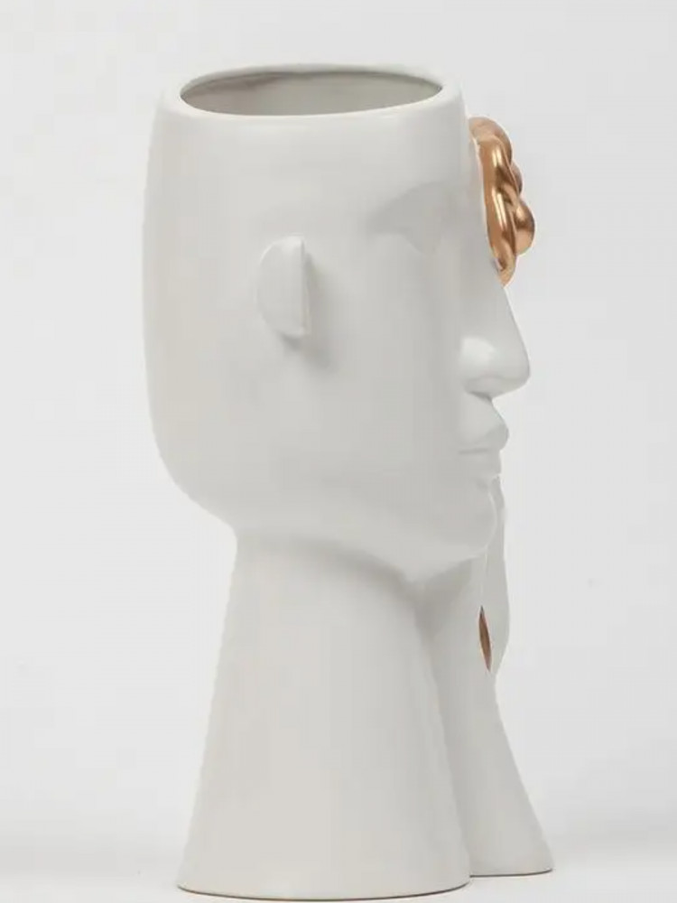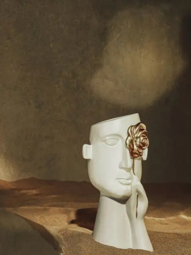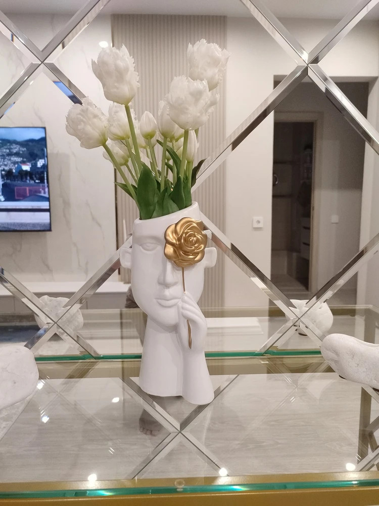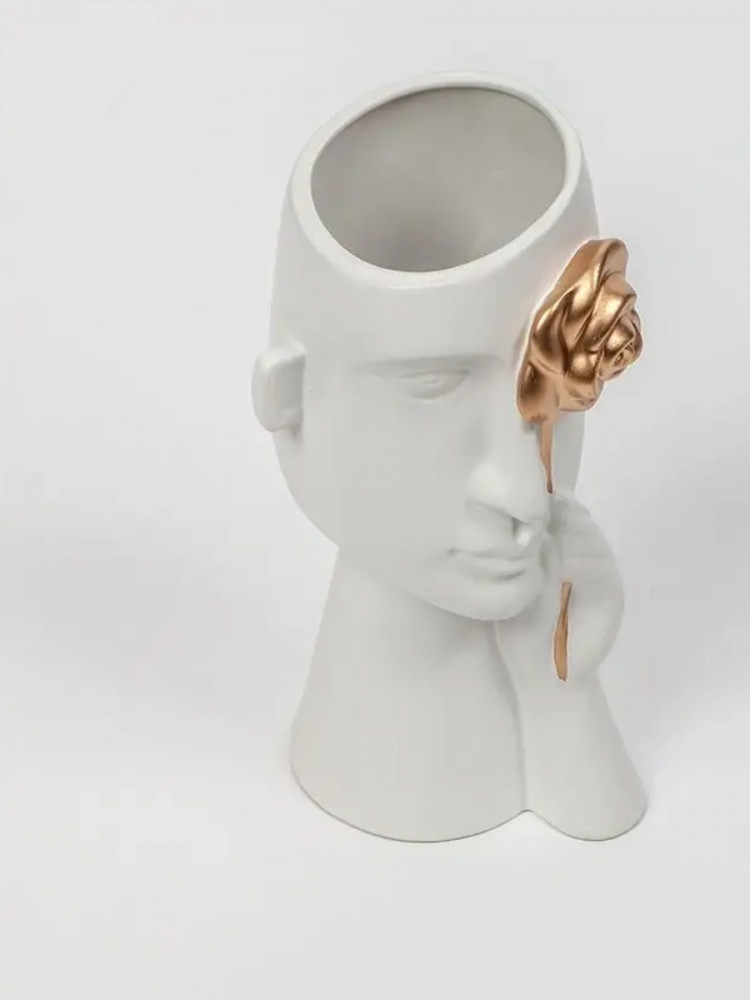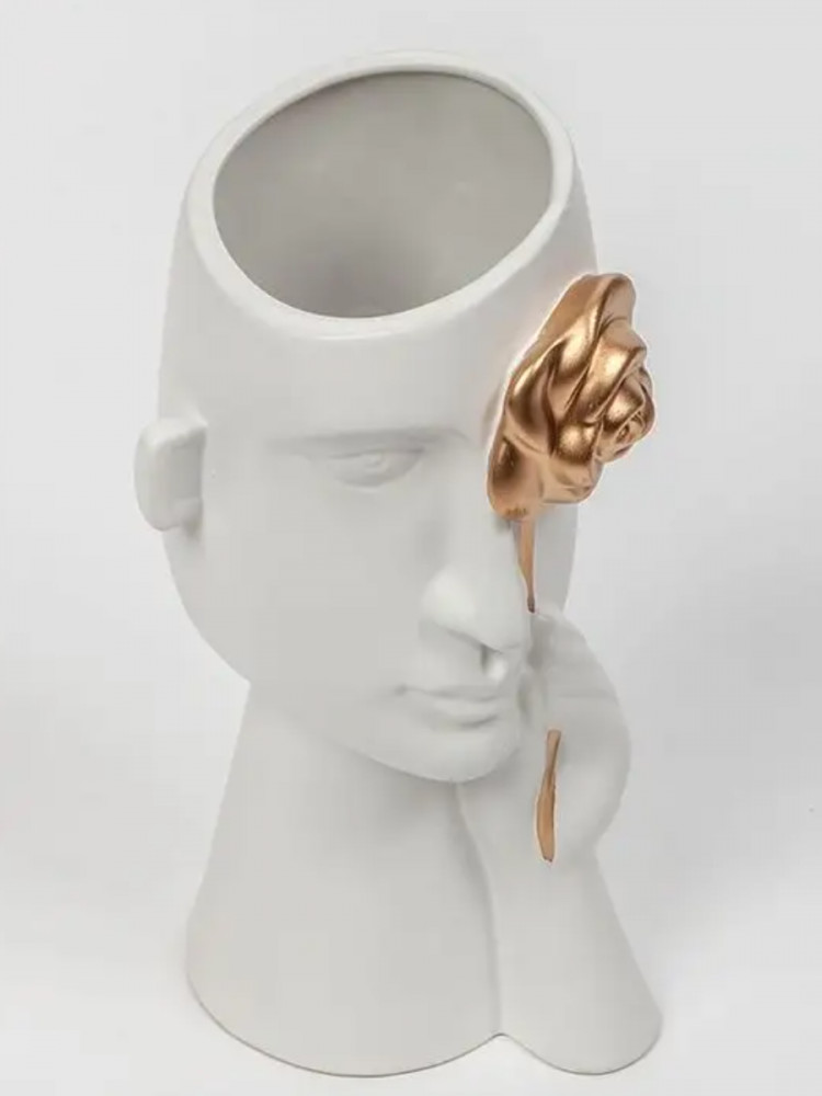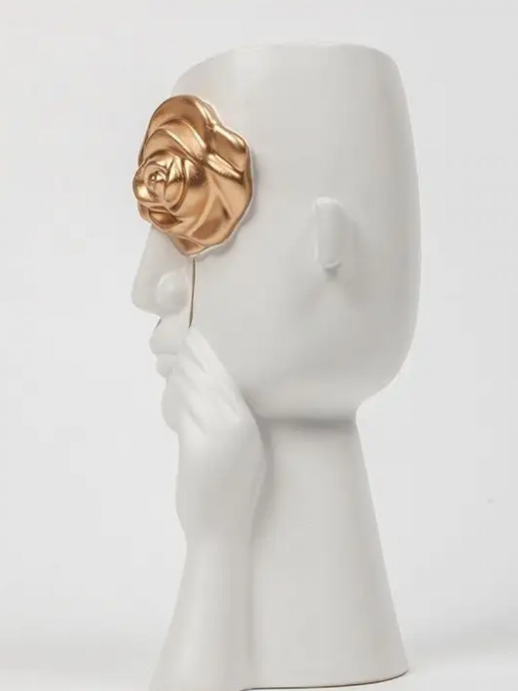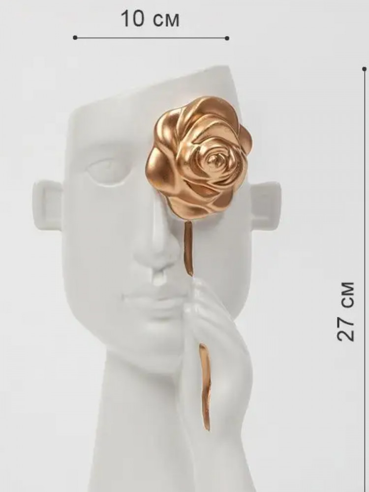 Декоративная ваза для цветов — красивое украшение интерьера. Ее оригинальный необычный дизайн по достоинству оценят те, кто любит интересные эстетичные штуки и уют в доме. Белая интерьерная вазочка выполнена в виде головы и руки, держащей золотую розу. Матовый черный цвет и золото красиво контрастируют друг с другом, выглядят очень презентабельно.