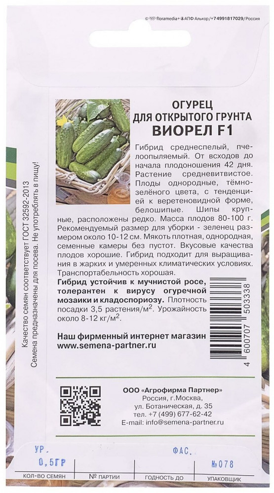 Партнер Огурец «Виорел F1»В данный момент этот товар отсутствует в продаже. Возможно, у нас найдется аналогичный или похожий товар здесь. Раннеспелый, пчелоопыляемый гибрид. От всходов до начала плодоношения 42 дня. Растение средневетвистое. Плоды однородные, тёмнозелёного цвета, с тенденцией к веретеновидной форме, белошипые. Шипы крупные, расположены редко. Масса плодов 80-100 г. Рекомендуемый размер зеленца для сбора 10-12 см. Мякоть плотная, однородная, семенные камеры без пустот. Вкусовые качества плодов хорошие. Пригоден для потребления в свежем виде и консервирования. Гибрид подходит для выращивания в жарких и умеренных климатических условиях. Транспортабельность хорошая. Гибрид устойчив к мучнистой росе, толерантен к вирусу огуречной мозаики и кладоспориозу. Плотность посадки 3-4 растения/м². Урожайность около 8.0-12.0 кг/м². |