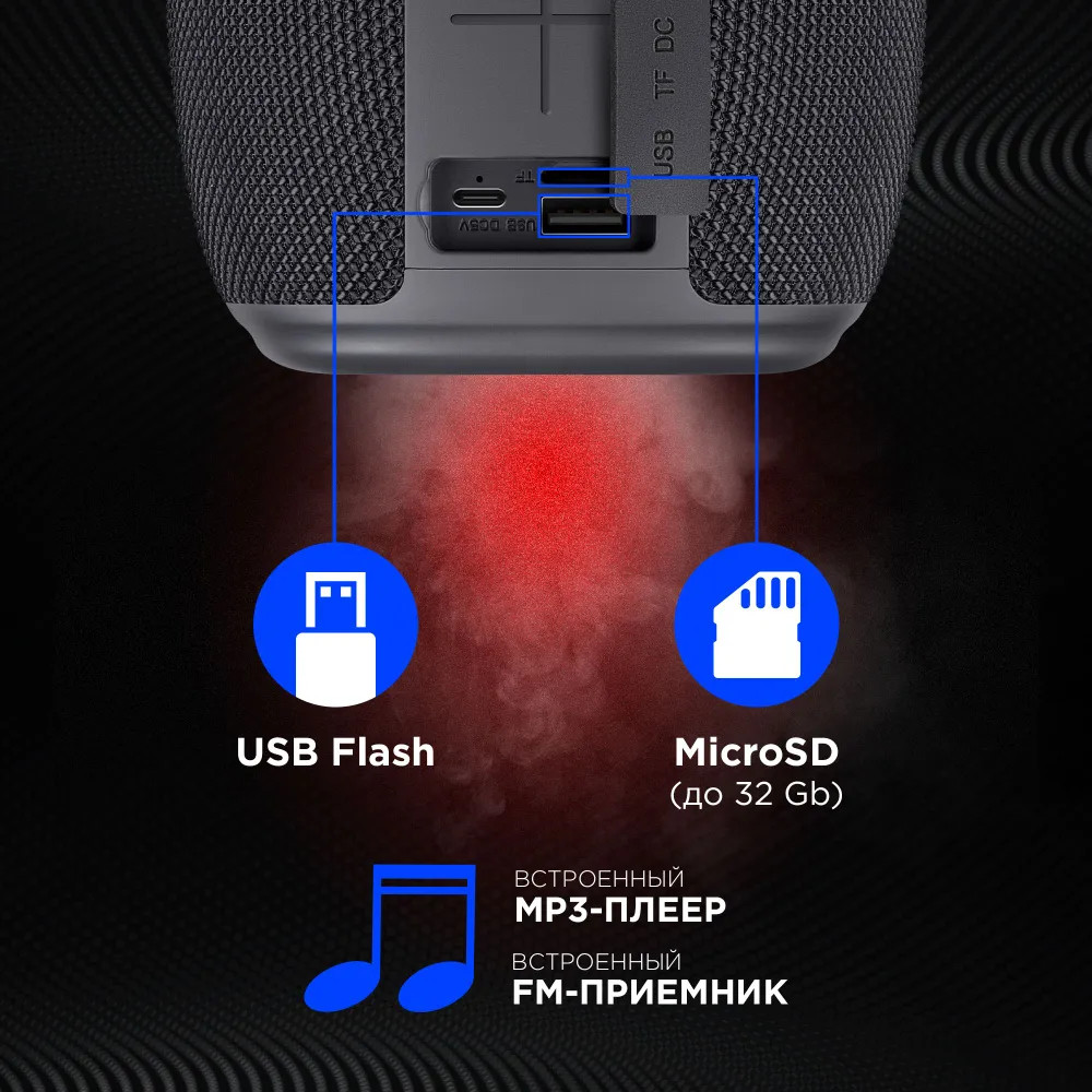 Портативная акустическая Bluetooth 5.3 система с LED подсветкой, встроенным MP3-плеером и FM-тюнером. Поддержка флеш накопителей и карт памяти microSD. Оптимальное звучание музыки в любом месте — это то, что может предложить наша беспроводная музыкальная колонка с Bluetooth-соединением. Идеально подходит для использования как дома, так и на улице, в машине, на велосипеде или в путешествиях.