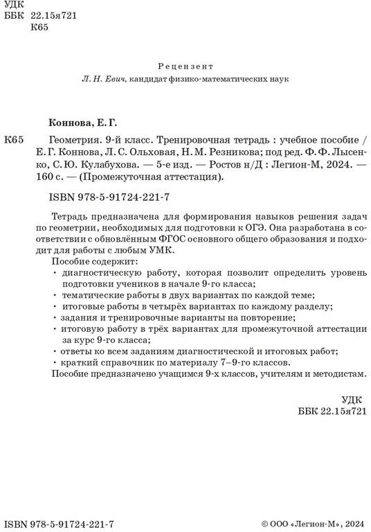 💳 Оплатить за товар можно при получении 🇰🇿 Есть бесплатная доставка по Казахстану от 1 дня 🎁 Копите бонусы с каждой покупки Серия: Промежуточная аттестация Тетрадь предназначена для формирования навыков решения задач по геометрии. Она разработана в соответствии с обновлённым ФГОС основного общего образования и подходит для работы с любым УМК. Пособие содержит: диагностическую работу, которая позволит определить уровень подготовки учеников в начале 9-го класса; тематические работы в двух вариантах по каждой теме; итоговые работы в четырёх вариантах по каждому разделу; задания и тренировочные варианты на повторение; итоговую работу в трёх вариантах для промежуточной аттестации за курс 9-го класса; ответы ко всем заданиям диагностической и итоговых работ; краткий справочник по материалу 7-9 классов. Пособие предназначено учащимся 9-х классов, учителям и методистам. |