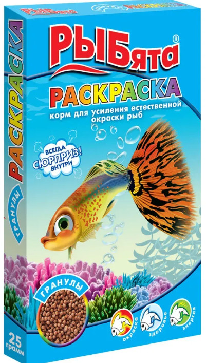 Рыбята Корм для стимулирования окраски рыб «Раскраска»В данный момент этот товар отсутствует в продаже. Возможно, у нас найдется аналогичный или похожий товар здесь. Корм «РЫБята «Раскраска» для большего богатства красок. В этом корме есть все необходимое для правильного питания и развития рыбок, в том числе витамины, микро- и макроэлементы. Кроме того, он содержит натуральные компоненты, способствующие проявлению яркой сверкающей окраски рыбок. Не замутняют воду. В каждой коробочке с кормом «РЫБята»® вы найдете красочную вырубную наклейку с милыми рыбками, героями наших упаковок. Собери свою коллекцию! |