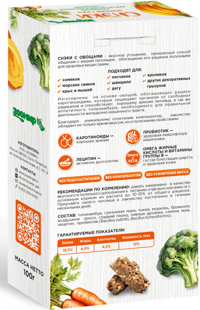 💳 Оплатить за товар можно при получении 🇰🇿 Есть бесплатная доставка по Казахстану от 1 дня 🎁 Копите бонусы с каждой покупки Серия: Снэки Снэки с овощами — вкусное угощение, прекрасный способ общения с вашим питомцем, обогащение его рациона полезными для здоровья веществами. Рекомендуются для хомяков, морских свинок, мышей, крыс, шиншилл, дегу, песчанок и других декоративных грызунов и кроликов. Изготовлены на основе овощей, обогащающих рацион каротиноидами, которые защищают организм от свободных радикалов и способствуют хорошему зрению питомца, а также аппетитного топинамбура, необходимого для правильной деятельности желудочно-кишечного тракта. Благодаря уникальному сочетанию компонентов, лакомство обладает не только ярким вкусом, но и полезными свойствами: |