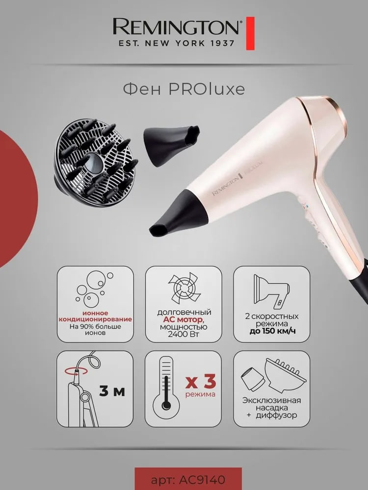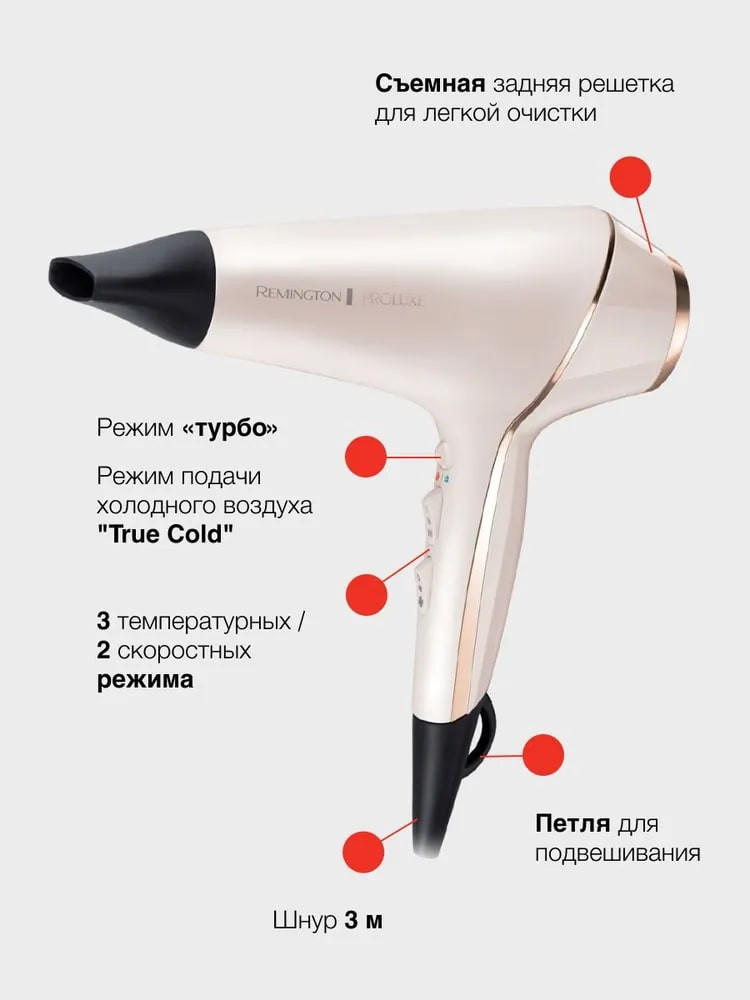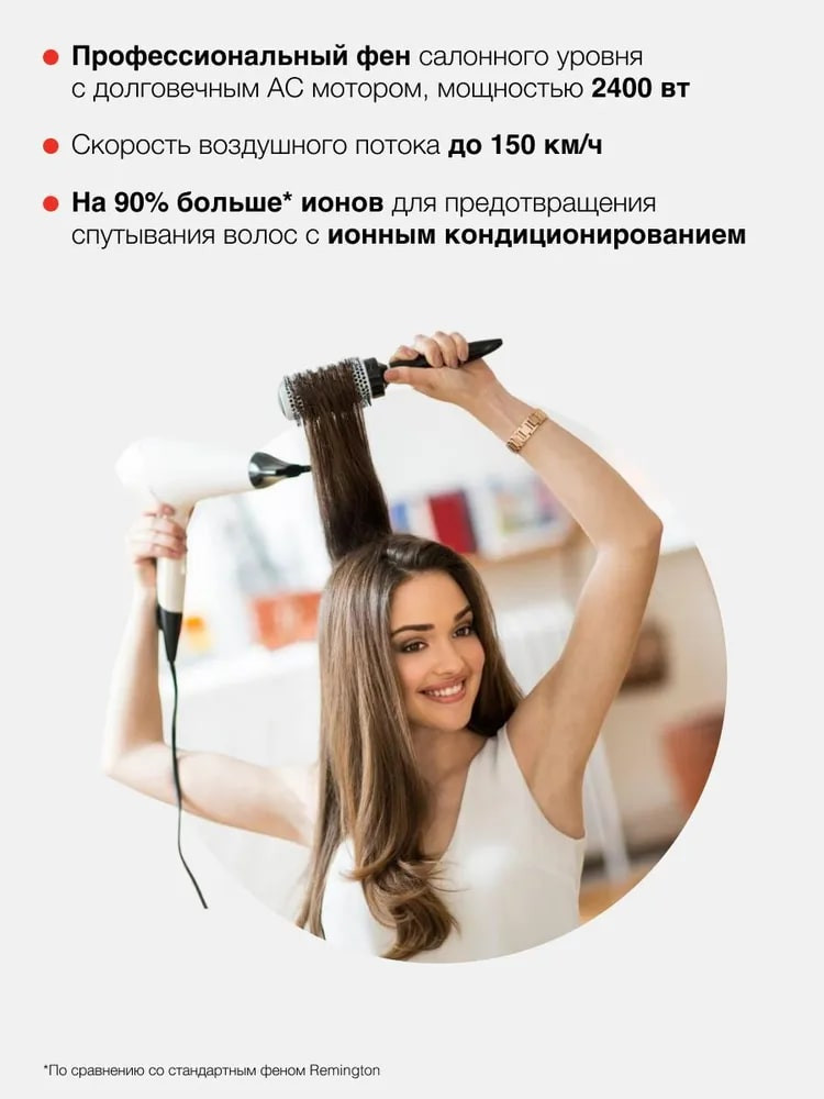Любой стайлинг начинается с простой сушки, во время которой важно создать гладкую «базу», без спутанных волос. Благодаря этому, будет значительно проще осуществлять последующую завивку или выпрямление. Ионизация — ключ к эффективной сушке, фен генерирует на 90% больше ионов, которые сглаживают молекулярную структуру волоса, препятствуя их спутыванию и добавляя им блеска. Здоровые волосы с безупречным результатом!