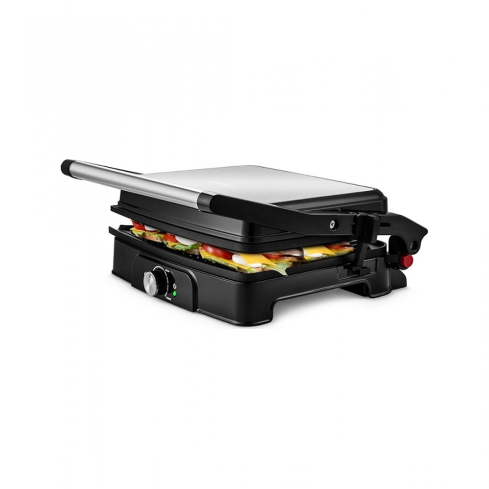 В одностороннем режиме крышка гриля откидывается на 180°, благодаря чему гриль превращается в большую жаровню, а продукты можно выложить сразу на две панели. Для раскладывания гриля предусмотрена специальная кнопка на боковой части корпуса. Используйте режим «приготовление с приоткрытой крышкой», если готовка в двустороннем режиме невозможна из-за того, что верхняя крышка может раздавить пищу под собственным весом, либо если продукты имеют неравномерную толщину. Например, для горячих бутербродов или пиццы.
