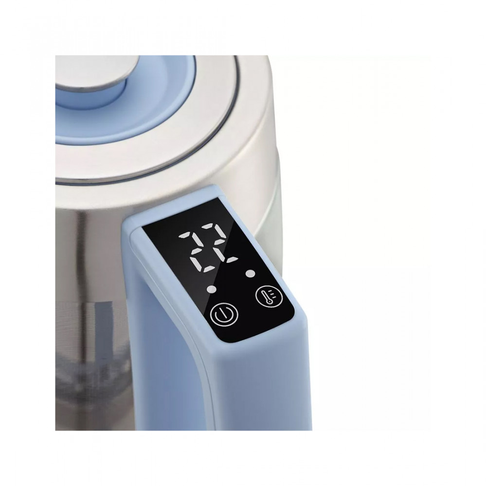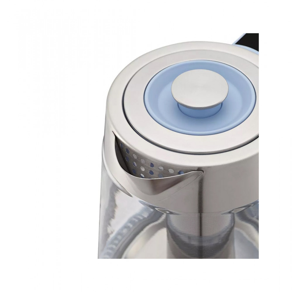 Съёмная крышка и широкое горлышко обеспечивают удобство при мытье и удалении накипи. Носик чайника спроектирован так, чтобы вода наливалась аккуратно, независимо от её объёма, а фильтр внутри носика предотвращает попадание накипи в чашку. Световой индикатор меняет цвет в зависимости от температуры воды: до 50 °С – белый, 50 °С – оранжевый, 60 °С – голубой, 70 °С – зелёный, 80 °С – синий, 90 °С – фиолетовый, от 95 °С – красный. Чайник позволяет заваривать различные сорта чая, такие как зелёный, чёрный, белый, улун или травяной, благодаря фильтру, который крепится к крышке и легко моется. Корпус изготовлен из стекла, пластика и металла, дно выполнено из металла, а крышка из сочетания пластмассы и нержавеющей стали. На стеклянной колбе нанесена мерная шкала. Объём 1,7 л подходит для большой семьи, позволяя заваривать чай или кипятить воду в достаточном количестве.