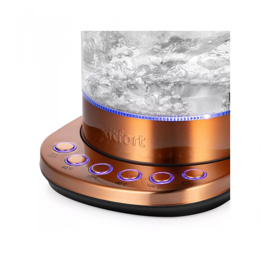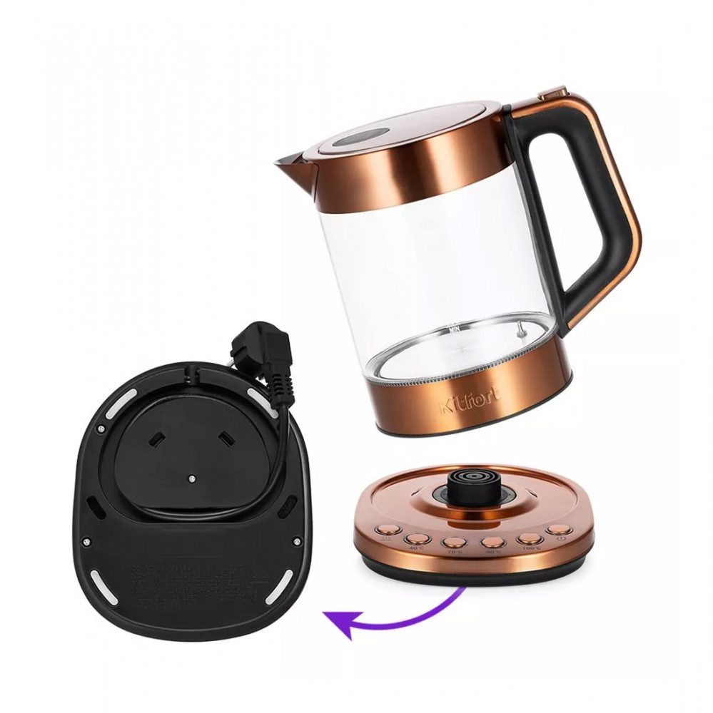 Kitfort Чайник электрический КТ-6657В данный момент этот товар отсутствует в продаже. Возможно, у нас найдется аналогичный или похожий товар здесь. Электрический чайник с терморегулятором КТ-6657 может вскипятить воду, а также нагреть её до температуры 40, 70 и 90°С, что очень удобно для заваривания различных сортов чая. Чайник также оснащён функцией поддержания температуры. На подставке чайника имеется 6 кнопок для выбора и включения режимов нагрева. Каждая кнопка оснащена световым индикатором, который отображает статус выбранного режима работы. Чайник автоматически отключается при закипании и при снятии его с подставки. Корпус чайника выполнен из нержавеющей стали, а подставка — из сочетания пластмассы и нержавеющей стали. Большой диаметр отверстия облегчает доступ при мойке. Ручка чайника имеет эргономичную форму и выполнена из термостойкого пластика. При включении чайника синяя подсветка по периметру дна сигнализирует о его рабочем состоянии, а также красиво подсвечивает воду. |