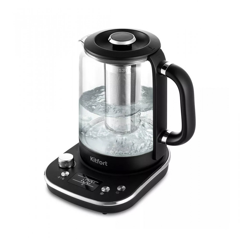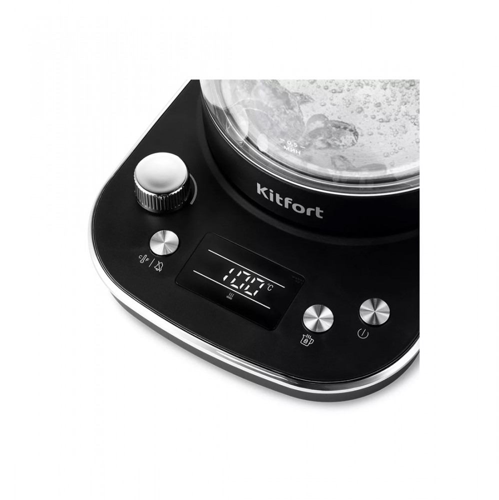 Электрический чайник с электронным терморегулятором Kitfort КТ-6157 может не только вскипятить воду, но и нагреть ее до температур: 38–100 °С с шагом 1 °С, что очень удобно при заваривании различных сортов чая и для приготовления детского питания.