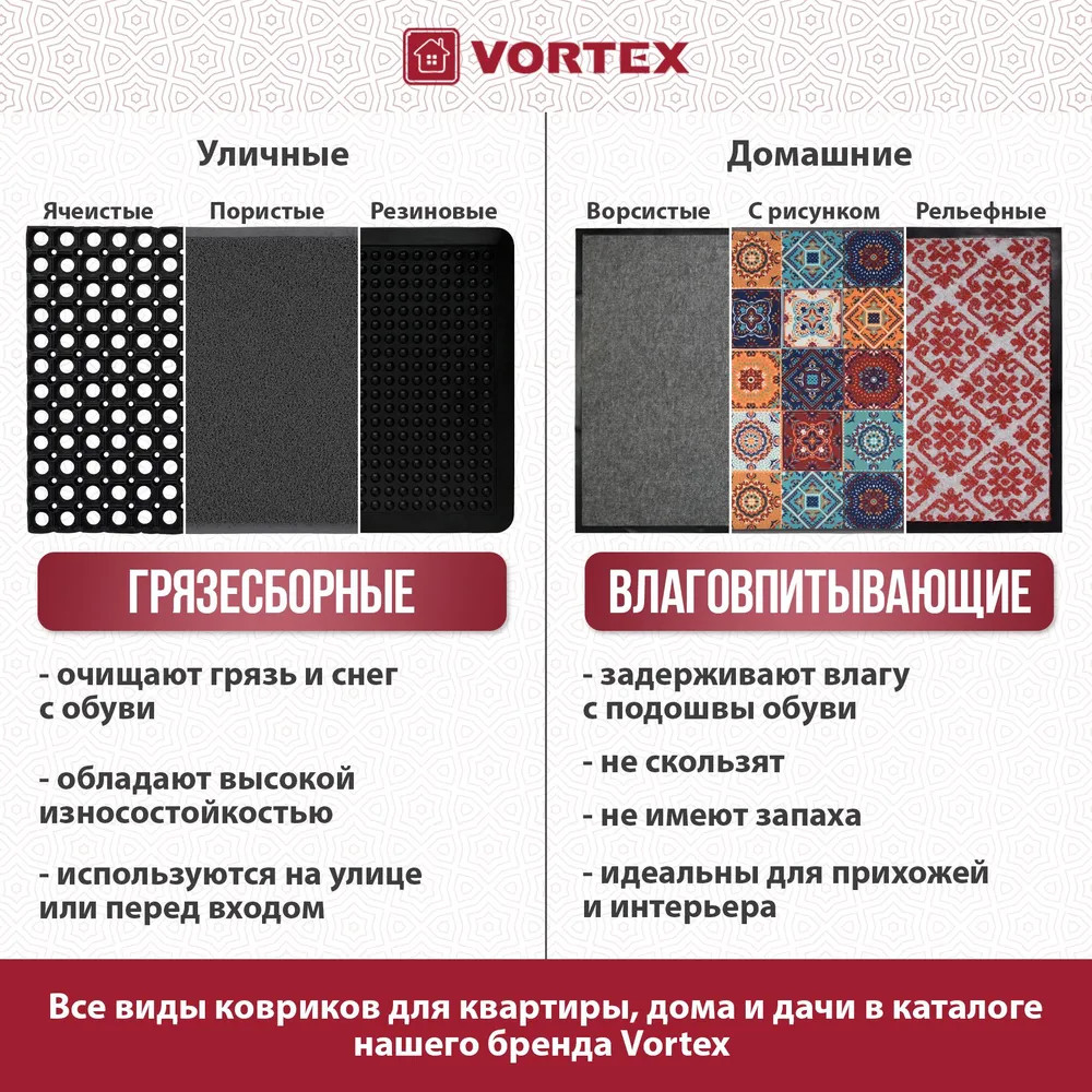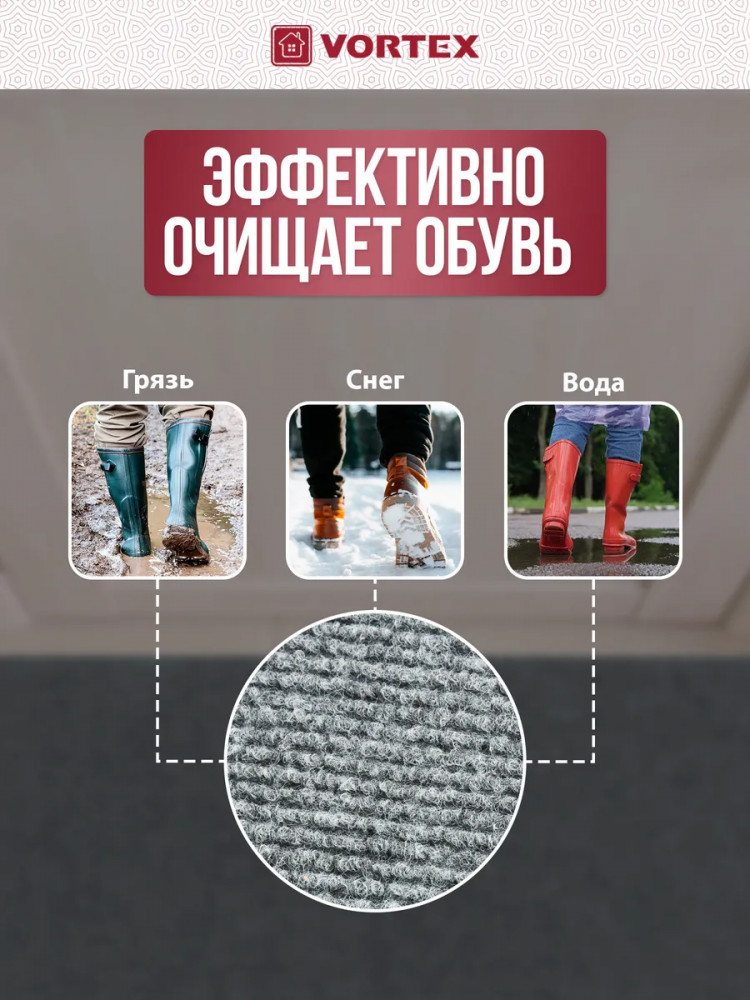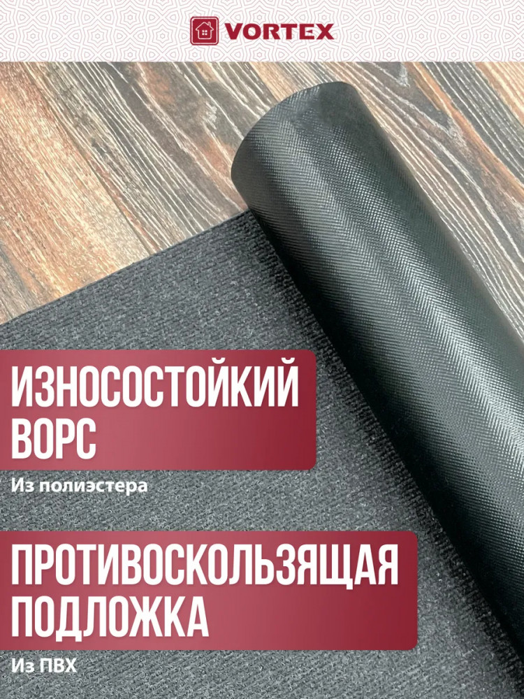 Улучшите уют и чистоту вашего дома с качественным придверным ковриком Vortex. Отличное решение для прихожих и коридоров вашей квартиры. Имеет крупный износоустойчивый ворс. Подходит для использования в местах с повышенной проходимостью, не скользит. Этот влаговпитывающий коврик поможет поддерживать чистоту на входе, собирая влагу после дождливого дня. Подходит как для размещения у входных дверей, так и в местах с повышенной проходимостью, для того что бы обувь оставалась сухой и защищала полы от излишней грязи. Придверный коврик обладает прорезиненной основой, обеспечивающей надежную фиксацию на полу. Ребристая поверхность и крупный ворс эффективно собирают пыль и грязь с обуви. Он прекрасно вписывается как в домашний интерьер, так и в офисные помещения. Материал: ворс (полиэстер), подложка — ПВХ.