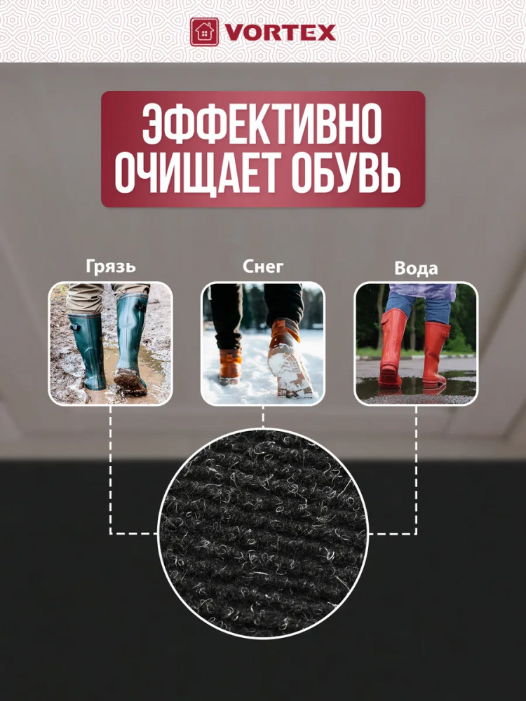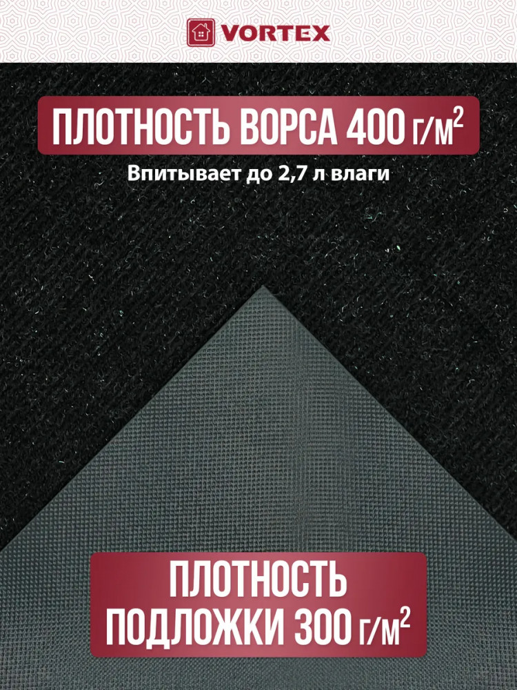 Улучшите уют и чистоту вашего дома с качественным придверным ковриком Vortex. Отличное решение для прихожих и коридоров вашей квартиры. Имеет крупный износоустойчивый ворс. Подходит для использования в местах с повышенной проходимостью, не скользит. Этот влаговпитывающий коврик поможет поддерживать чистоту на входе, собирая влагу после дождливого дня. Подходит как для размещения у входных дверей, так и в местах с повышенной проходимостью, для того что бы обувь оставалась сухой и защищала полы от излишней грязи. Придверный коврик обладает прорезиненной основой, обеспечивающей надежную фиксацию на полу. Ребристая поверхность и крупный ворс эффективно собирают пыль и грязь с обуви. Он прекрасно вписывается как в домашний интерьер, так и в офисные помещения. Материал: ворс (полиэстер), подложка — ПВХ.