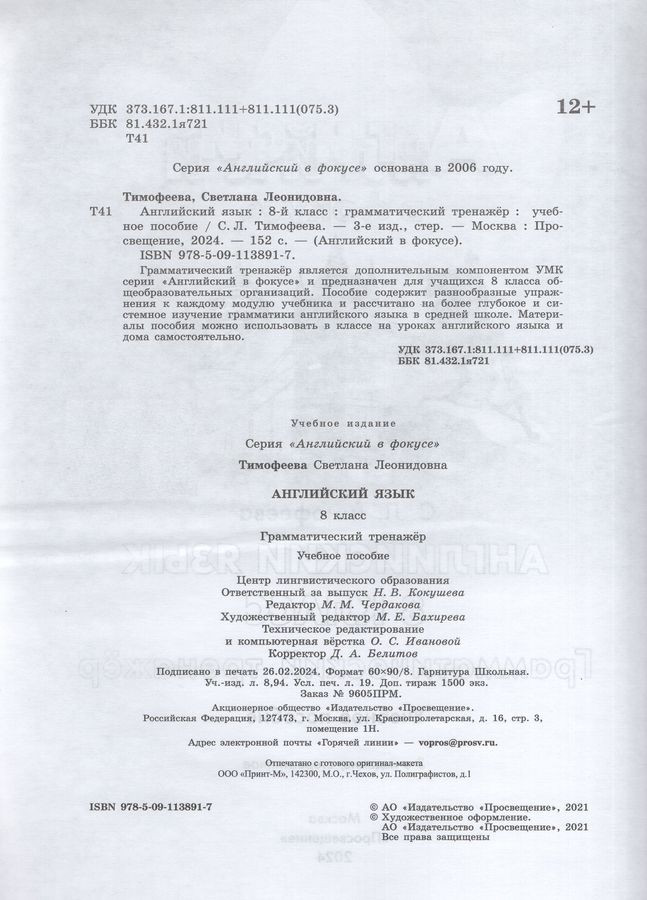 💳 Оплатить за товар можно при получении 🇰🇿 Есть бесплатная доставка по Казахстану от 1 дня 🎁 Копите бонусы с каждой покупки Серия: Английский в фокусе Грамматический тренажёр является дополнительным компонентом УМК серии «Английский в фокусе» и предназначен для учащихся 8 класса общеобразовательных организаций. Пособие содержит разнообразные упражнения к каждому модулю учебника и рассчитано на более глубокое и системное изучение грамматики английского языка в средней школе. Материалы пособия можно использовать в классе на уроках английского языка и дома самостоятельно. |