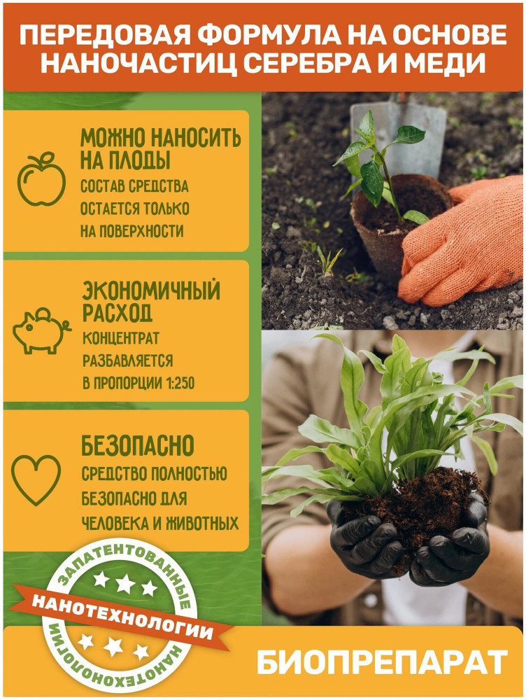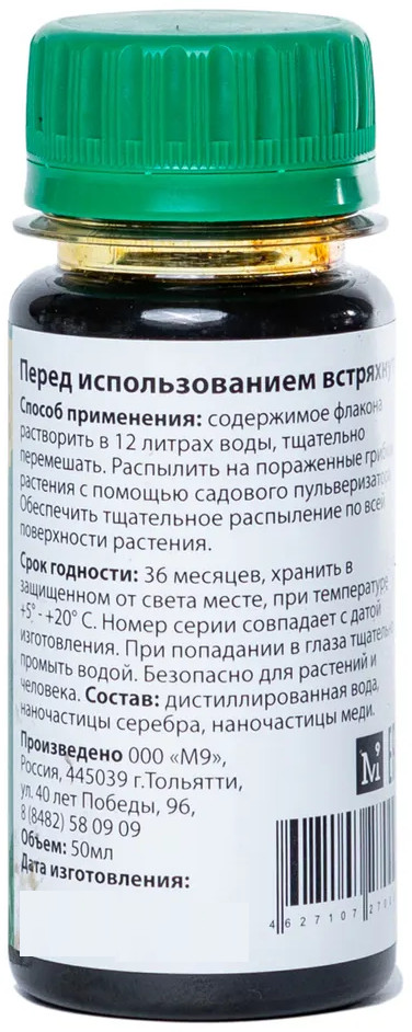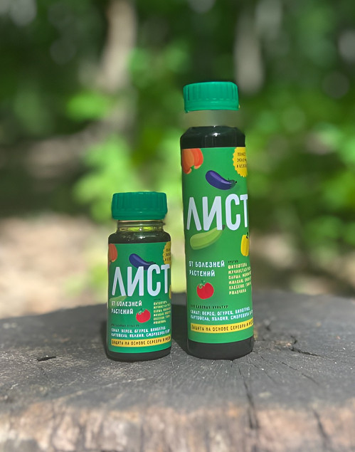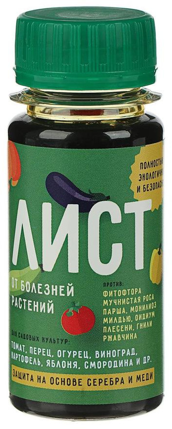 Лист» на основе наночастиц серебра и меди для борьбы с грибковыми и бактериальными заболеваниями растений. Средство экологично и безопасно для растений и человека. Не содержит токсичных компонентов. Подходит для обработки садовых культур семейства пасленовых (картофель, баклажан, томат, перец и др), тыквенных (дыни, огурцы, тыквы, арбузы и др.), плодовых кустарников, винограда, плодовых деревьев (яблоня, вишня). Подходит для обработки семян, теплиц и мест хранения урожая.