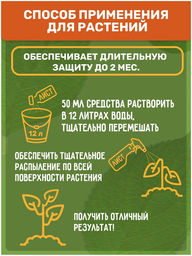 Способ применения: содержимое растворить в 12 л воды, тщательно перемешать. С помощью пульверизатора распылить на пораженные инфекцией растения. Обеспечить тщательное распыление по всей поверхности растения.