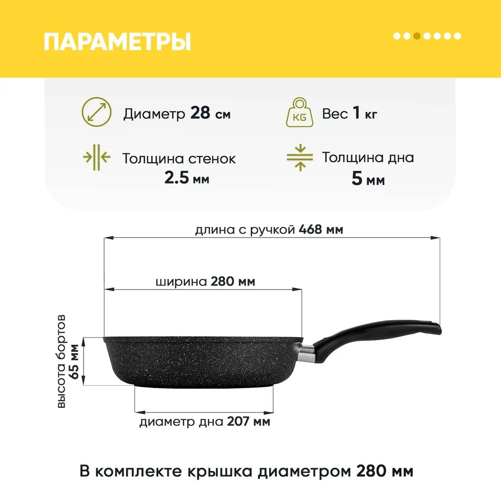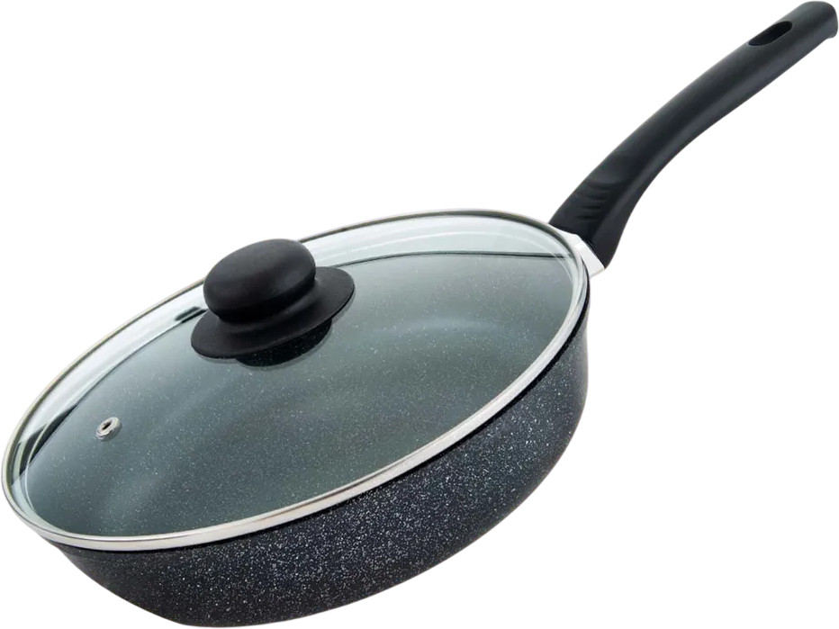 Внешний вид сковороды напоминает камень гранит, этот рисунок наносится на базовое покрытие. Иногда можно встретить название «мраморная крошка», этот рисунок придает индивидуальность и стильный вид современной посуде для приготовления. Антипригарное покрытие отличается особой износостойкостью и превосходными антипригарными свойствами, рассчитано на интенсивное использование в течение длительного срока. Можно готовить на любой плите. Однако, для индукционной плиты понадобится специальный адаптер. Эргономичная ручка сделана из бакелита, этот материал не нагревается в процессе приготовления и прихватки не понадобятся при условии правильного расположения сковороды на плите. В данной модели ручка не съемная. Оптимальная высота бортов делают эту посуду идеальной для приготовления блюд, в которых достаточно много жидкости или объема.