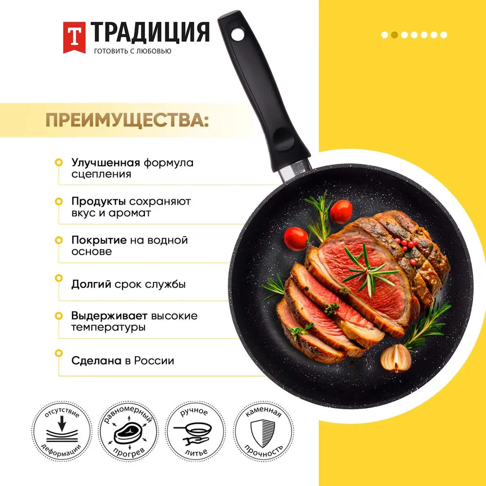 Самый популярный и незаменимый предмет на кухне – это классическая глубокая литая сковорода с антипригарным покрытием. Литая посуда равномерно прогревается и достаточно долго сохраняет тепло, она не такая тяжелая, как чугунная сковорода. Подходит для частого применения, идеальна для жарки и тушения, для приготовления курицы, фарша, филе, котлет, мяса, картошки, сырников, овощей, драников, печени, грибов – и все это при возможности использования минимального количества масла или совсем без него. Благодаря толстому дну и стенкам продукты в сковороде равномерно прогреваются, а также сковорода сохраняет остаточное тепло в течение длительного времени. Сковорода ТМ "Традиция готовить с любовью" абсолютно безопасна для здоровья, на ее поверхность нанесено высококачественное минеральное покрытие на водной основе. Современная 5-ти слойная система покрытия защищает продукты от пригорания. Антипригарное покрытие на водной основе не содержит PFOA, это экологично и безопасно.