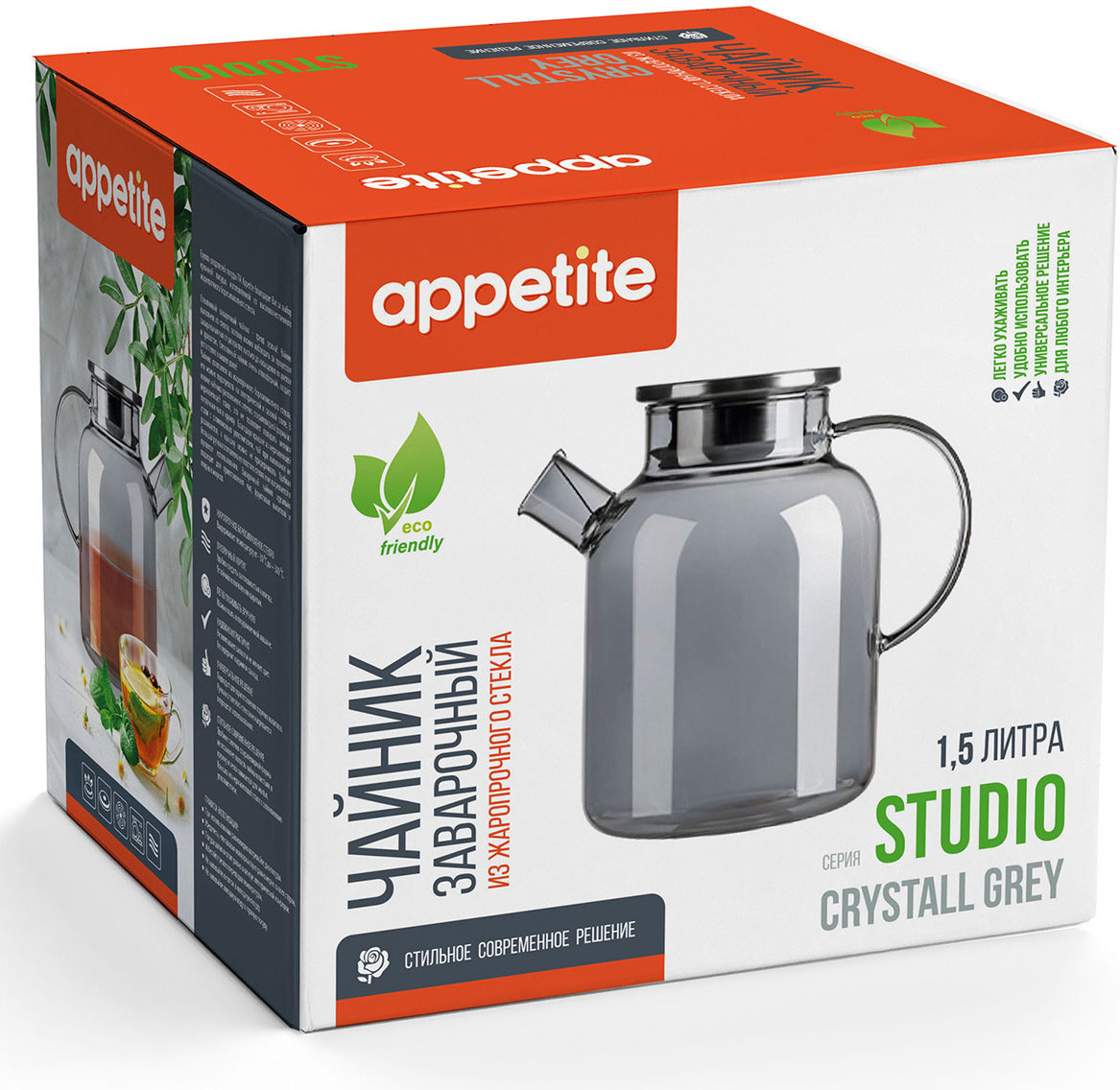 Заварочный чайник «Crystall Grey Studio» от бренда Appetite — это стильный и функциональный аксессуар для вашей кухни. Он изготовлен из жаропрочного стекла, что делает его устойчивым к перепадам температуры. Благодаря этому вы можете использовать его как для горячих, так и для холодных напитков. Чайник имеет объём 1500 мл, что позволяет заваривать достаточное количество чая для всей семьи или гостей. Крышка чайника выполнена из металла и оснащена силиконовой вставкой, которая обеспечивает плотное прилегание и сохраняет тепло внутри чайника. Ручка чайника сделана из стекла и не нагревается, поэтому вы сможете безопасно разливать чай по чашкам. Фильтр-пружинка, расположенный внутри чайника, удерживает листики заварки при разливании чая, обеспечивая удобство использования и мытья. Стильный дизайн и функциональность делают этот заварочный чайник отличным выбором для любого дома. Он станет прекрасным дополнением к вашей коллекции посуды и позволит вам наслаждаться ароматным чаем каждый день.