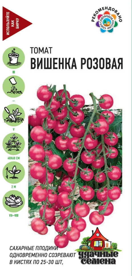 Раннеспелый (112 дней от всходов до плодоношения) высокорослый сорт для выращивания в пленочных теплицах. Растение индетерминантное (с неограниченным ростом), высотой более 2 м. Плоды округлые, розового цвета, массой до 18гр, с десертным вкусом. Для приготовления ярких свежих салатов, аппетитных закусок и разноцветных консервированных ассорти. Урожайность до 3,5 кг/м². Посев на рассаду — в конце марта — начале апреля. Пикировка — в фазе первого настоящего листа. Высадка рассады — в начале середине мая (если апрель теплый, то высадка рассады возможна в конце апреля). Формируют в один стебель, удаляя все «пасынки». При образовании 5-го соцветия начинают удалять нижние листья по 2-3 в неделю. После образования 8-10 кистей побег прищипывают, оставляя 2 листа над последней кистью. Схема посадки: 40 × 60 см. |