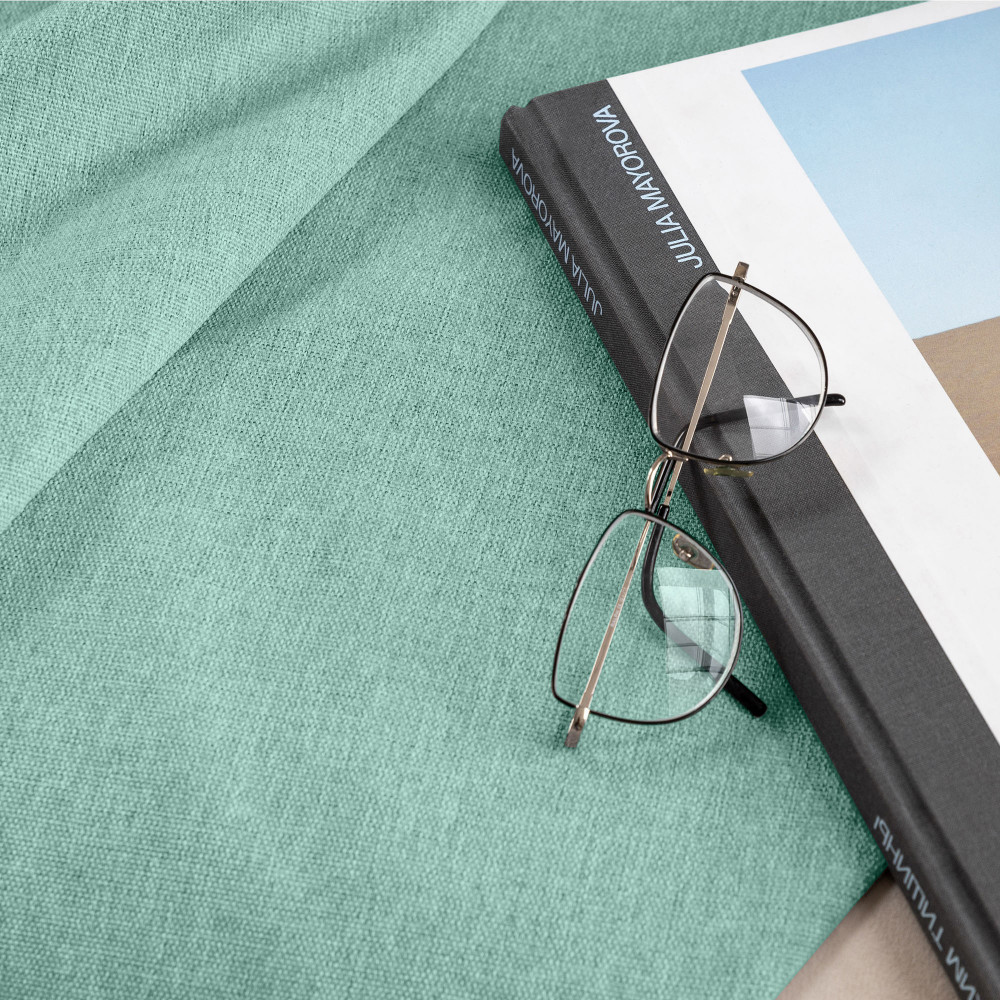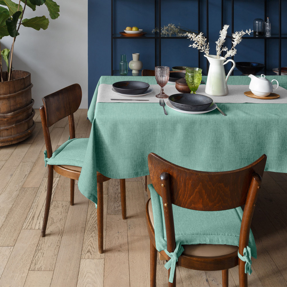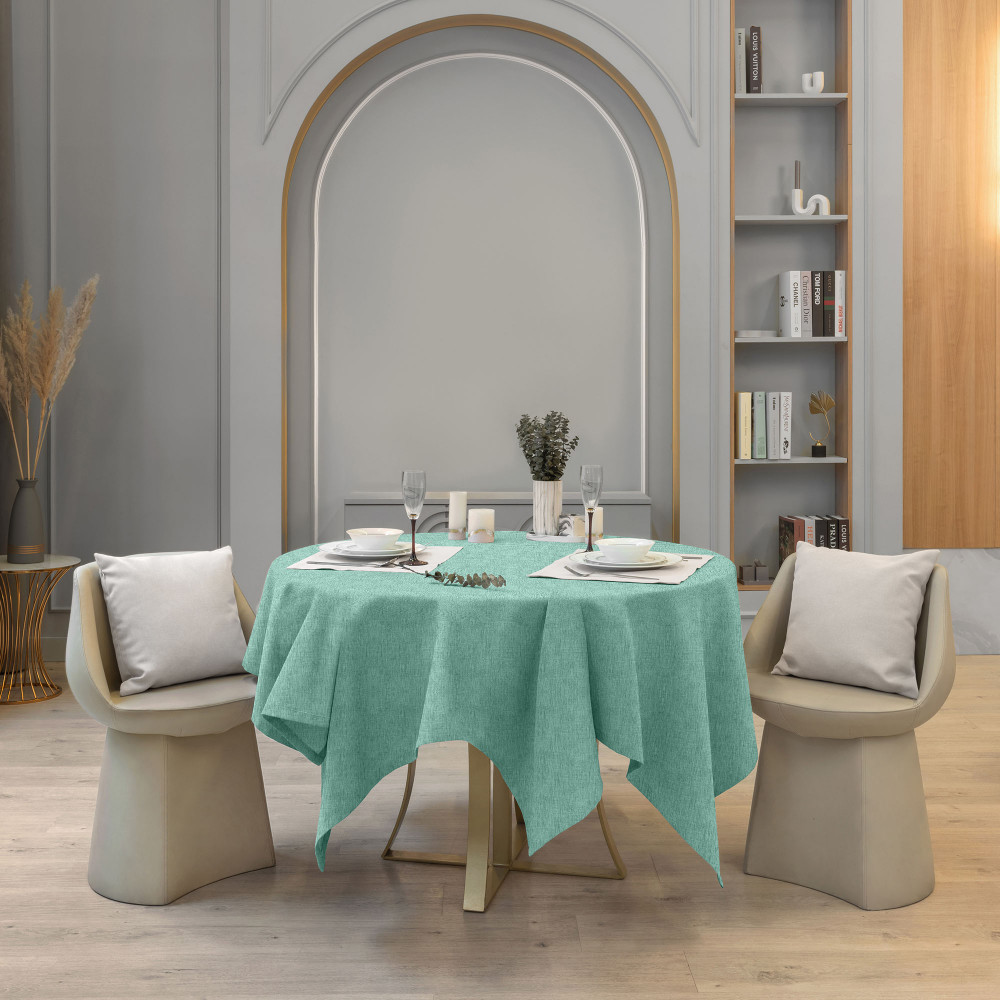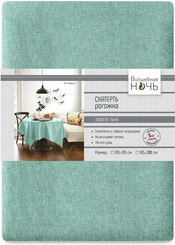 Скатерть неплохая, но имеет мало отношения к картинке. Вместо насыщенного цвета морской волны - светло-бирюзовый. Прокрас - пестрый, видимо, чтобы подчеркнуть фактуру. Ткань, как и подобает рогожке, скорее жесткая, не фалдит. Край подогнут и прострочен. Отстрочка среднего качества.