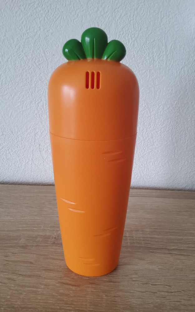 Яркий, крепкий, устойчивый. Размеры 7×5,5×21,5. Крышку использовать, как стаканчик, не получится, так как на ней расположены вентиляционные отверстия. На дне самого футляра их нет.