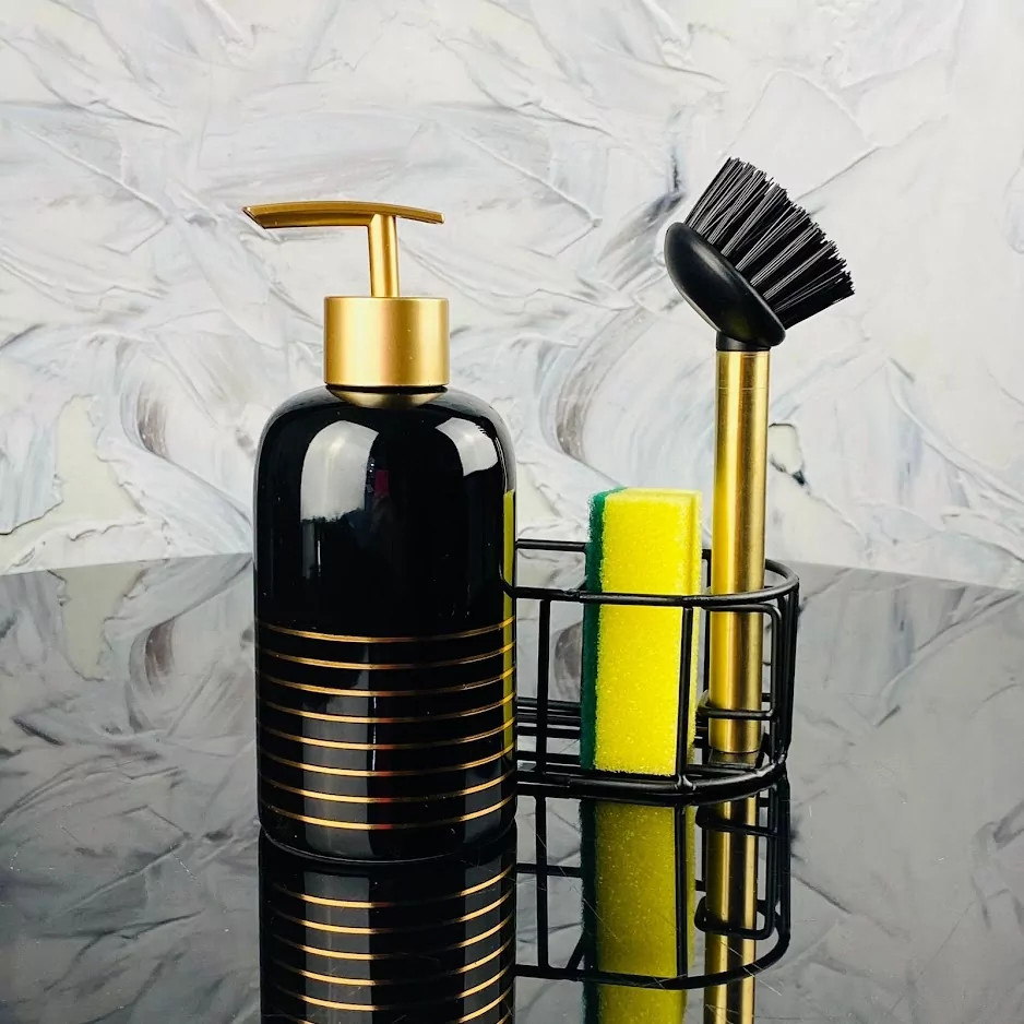 💳 Оплатить за товар можно при получении 🇰🇿 Есть бесплатная доставка по Казахстану от 1 дня 🎁 Копите бонусы с каждой покупки Набор аксессуаров для кухни состоит из трех предметов: подставка, дозатор для жидкого мыла, щетка, губка для мытья посуды. Набор выполнен из высококачественного фарфора с глянцевой черной эмалью и золотым декором. |
