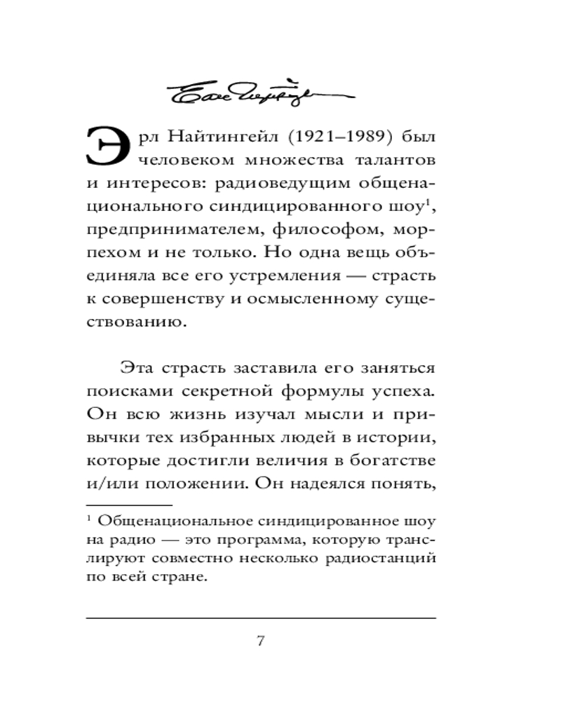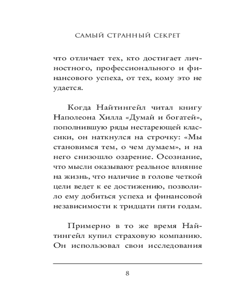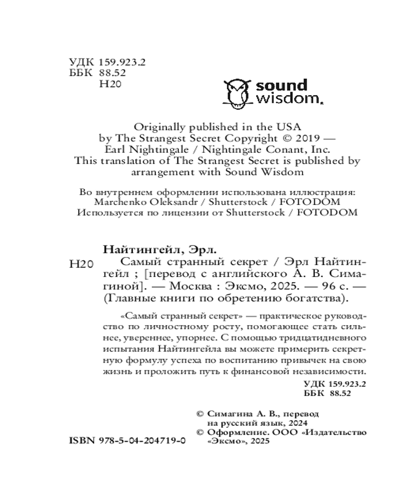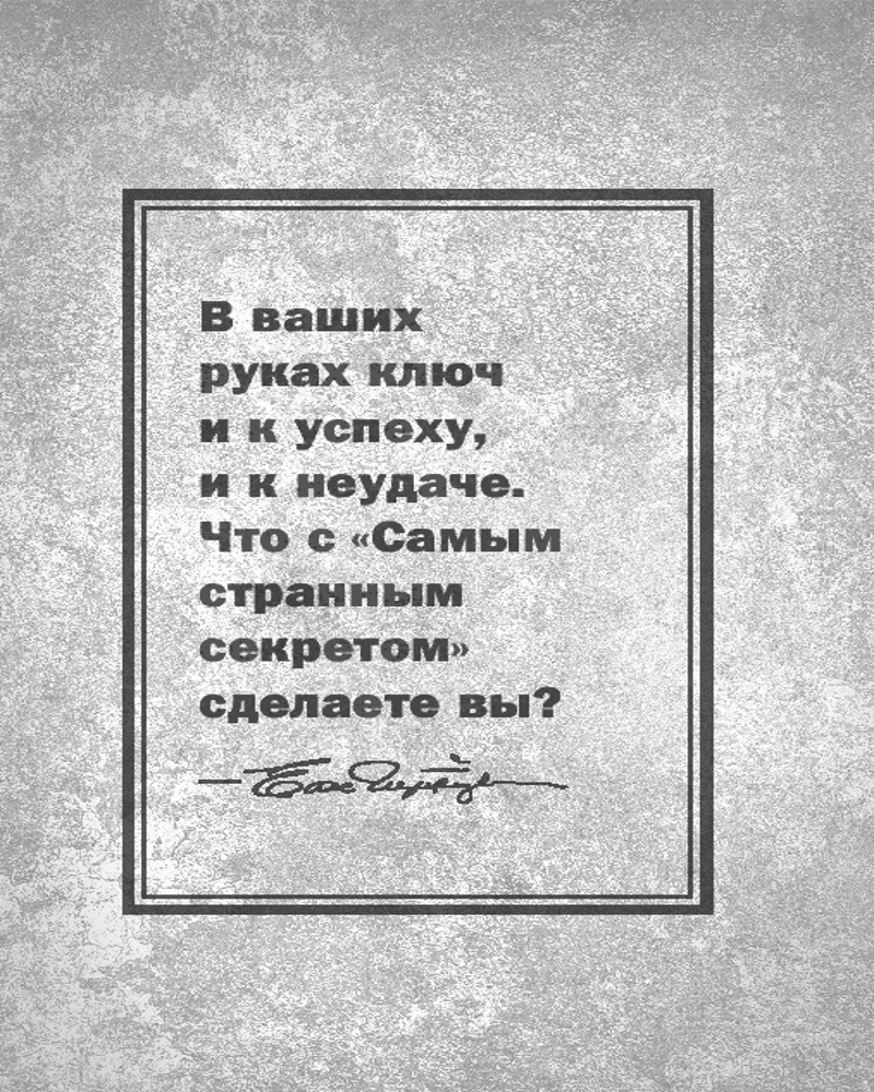 💳 Оплатить за товар можно при получении 🇰🇿 Есть бесплатная доставка по Казахстану от 1 дня 🎁 Копите бонусы с каждой покупки Серия: Главные книги по обретению богатства В ваших руках ключ и к успеху, и к неудаче. Что с «Самым странным секретом» сделаете вы? В 1956 году Эрл Найтингейл, мотивационный спикер, радиоведущий и предприниматель, записал аудиосообщение, чтобы подбодрить своих сотрудников. Молва об этой речи распространилась мгновенно, и офис был завален просьбами о ее копии. Расшифрованная аудиозапись — одна из самых вдохновляющих речей всех времен, ставшая первым устным выступлением, получившим «Золотой диск», и проданная тиражом более миллиона копий — лежит прямо на страницах этой книги. |