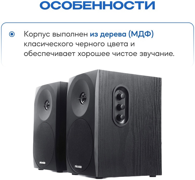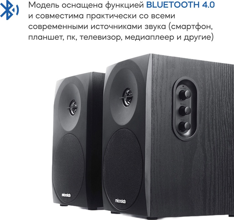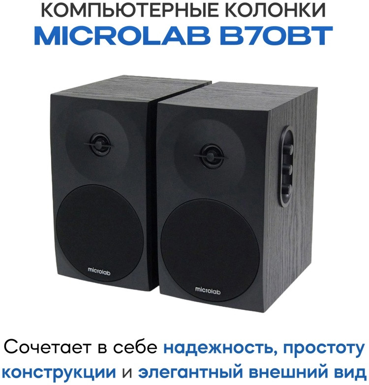Акустическая стереосистема Microlab B70BT сочетает в себе надежность, простоту конструкции и элегантный внешний вид. Корпус выполнен из дерева (МДФ) класического черного цвета и обеспечивает хорошее чистое звучание. Декоративная накладка из акустической ткани защищает динамики, но не закрывает лицевую панель полностью, подчеркивая тем самым уникальность дизайна сателлитов. Порт фазоинвертора на тыльной стенке корпуса: сочетание геометрических размеров внутреннего объема и трубы обеспечивают заданную резонансную частоту. Фазоинвертор позволяет существенно понизить нижнюю граничную частоту и заметно увеличить уровень её звукового давления на низких частотах. Модель оснащена функцией Bluetooth версии 4.0 и совместима практически со всеми современными источниками звука (смартфон, планшет, ПК, телевизор, медиаплеер и другие). Колонки воспроизводят достаточно мощный и чистый звук. На самой высокой громкости искажения отсутствуют, а низкие частоты не дребезжат. Весь диапазон частот чётко различим, при необходимости можно отрегулировать высокие и низкие частоты с помощью регуляторов на боковой стороне активного сателлита.