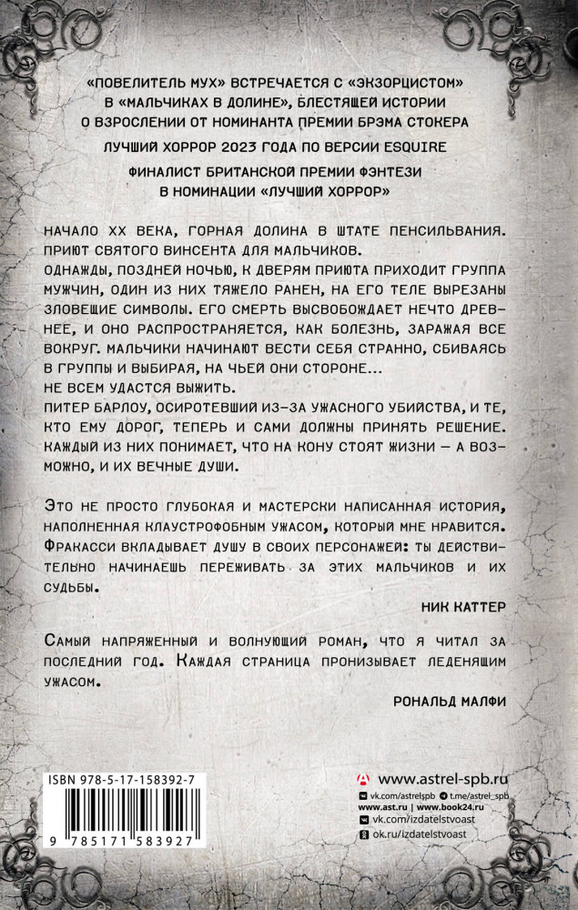 Мальчики в долинеВ данный момент этот товар отсутствует в продаже. Возможно, у нас найдется аналогичный или похожий товар здесь. Серия: Мастера ужасов Начало XX века, горная долина в штате Пенсильвания. Приют Святого Винсента для мальчиков. Однажды, поздней ночью, к дверям приюта приходит группа мужчин, один из них тяжело ранен, на его теле вырезаны зловещие символы. Его смерть высвобождает нечто древнее, и оно распространяется, как болезнь, заражая всё вокруг. Мальчики начинают вести себя странно, сбиваясь в группы и выбирая, на чьей они стороне... |