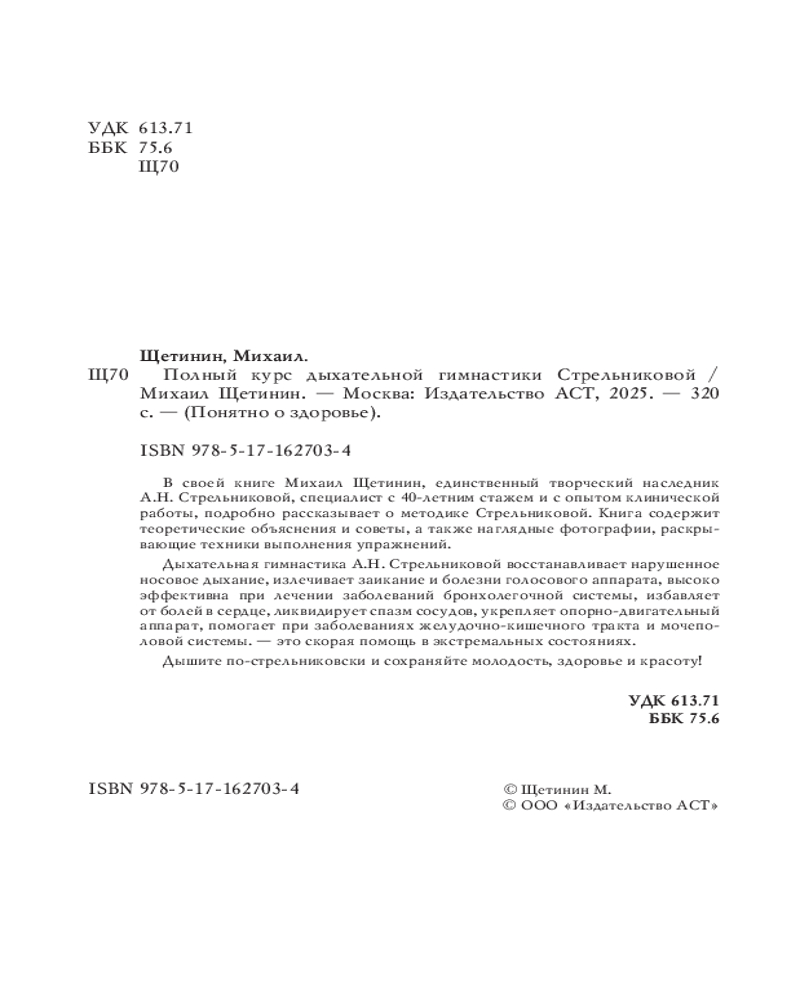 В данный момент этот товар отсутствует в продаже. Возможно, у нас найдется аналогичный или похожий товар здесь. Серия: Понятно о здоровье В своей книге Михаил Щетинин, единственный творческий наследник А. Н. Стрельниковой, специалист с 40-летним стажем и с опытом клинической работы, подробно рассказывает о методике Стрельниковой. Книга содержит теоретические объяснения и советы, а также наглядные фотографии, раскрывающие техники выполнения упражнений.