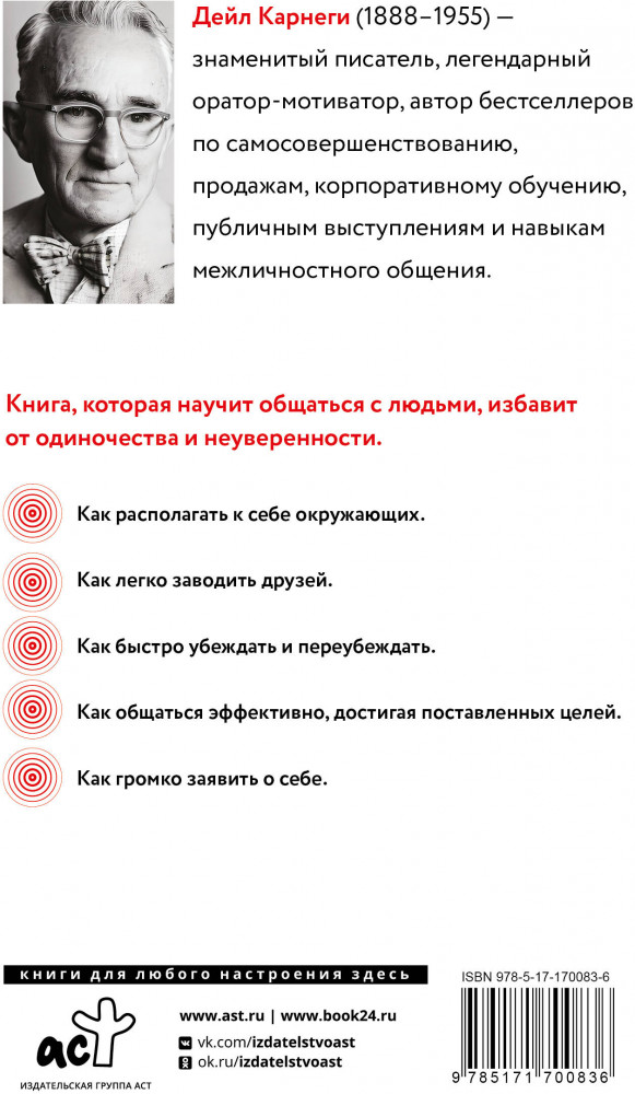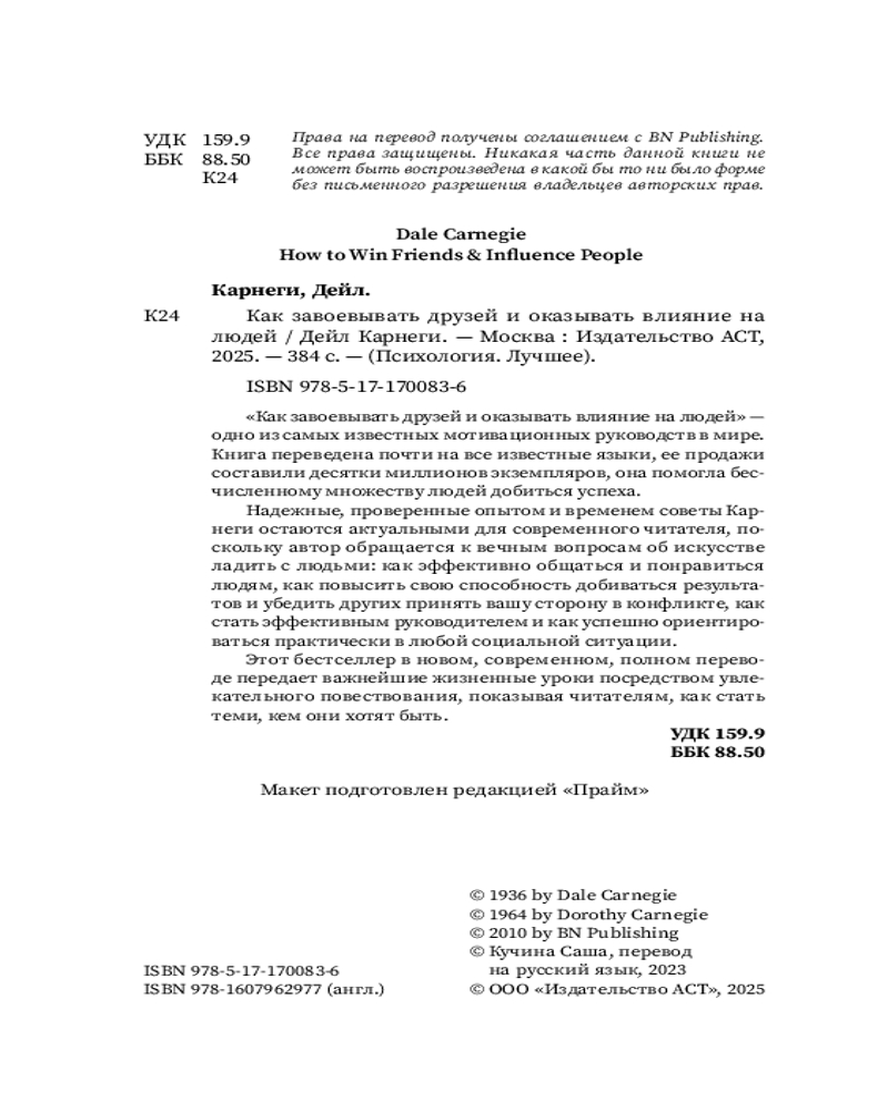 💳 Оплатить за товар можно при получении 🇰🇿 Есть бесплатная доставка по Казахстану от 1 дня 🎁 Копите бонусы с каждой покупки Серия: Психология. Лучшее Одно из самых известных мотивационных руководств в истории, проданное десятками миллионов экземпляров, переведенное почти на все известные письменные языки, оно помогло бесчисленному множеству людей добиться успеха. Надежные, проверенные опытом и временем советы Карнеги остаются актуальными для современного читателя, поскольку автор обращается к вечным вопросам об искусстве ладить с людьми. |