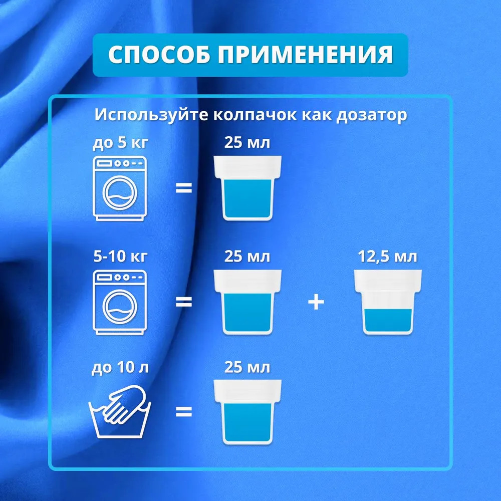 • при ручной стирке 1 колпачок средства добавьте к 10 литрам воды при последнем полоскании и выдержите одежду в этом растворе 3-5 минут. Повторно полоскать бельё после этого не нужно.