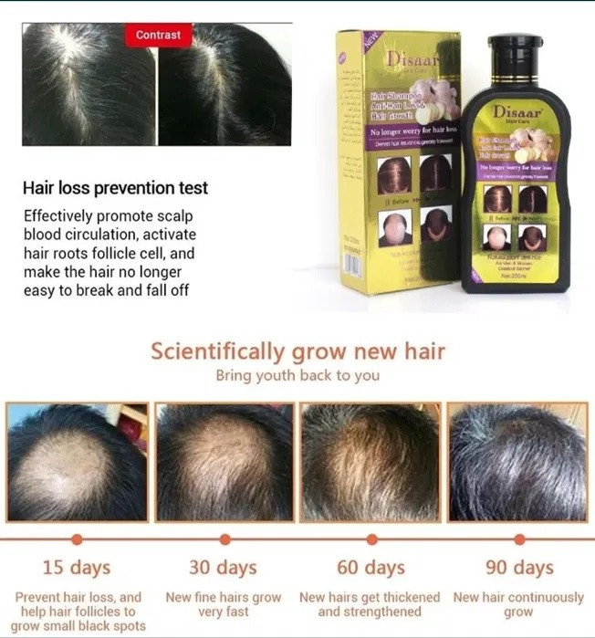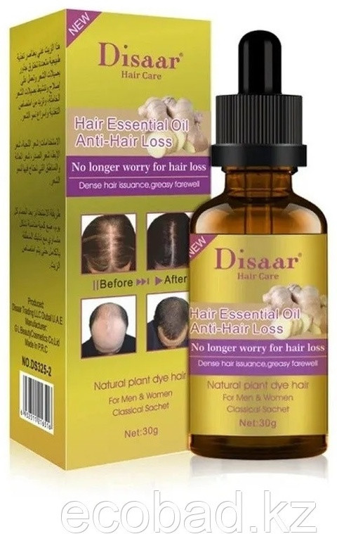 Сыворотка для роста волос (30 гр) Disaar Hair Essence Oil — растительный активатор, который восстанавливает питание кожи головы, нормализует работу сальных желез и укрепляет волосы. В составе — корень имбиря, экстракт женьшеня, китайский рунический цветок и масло виноградных косточек. Сыворотка стимулирует рост новых волос, улучшает густоту и придает блеск. Через месяц использования заметен рост волос на 2-5 см и появление новых волосков. Продукт подходит для тонких, ломких волос и при замедленном росте. Противопоказания: индивидуальная непереносимость, не рекомендуется детям до 7 лет.