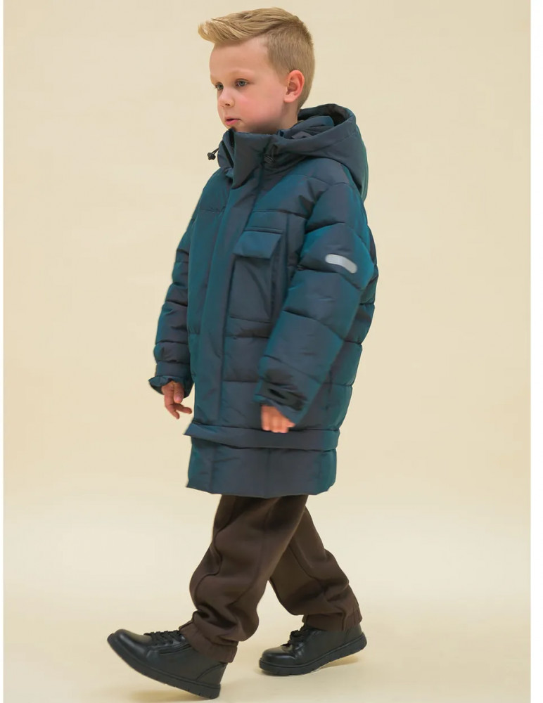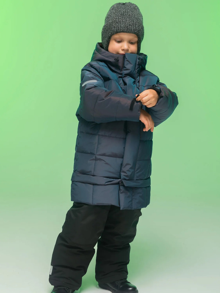 Пуховик зимний для мальчика из мембранной ткани. На внешнюю поверхность материала нанесена водоотталкивающая пропитка (DWR), она задерживает грязь и влагу снаружи — ребёнок не промокнет. Также есть дополнительная пропитка на внутренней стороне ткани. Куртка прямого оверсайз-силуэта подходит для любого типа фигуры. Капюшон с двумя швами, что обеспечивает анатомически правильную форму и комфортную посадку по голове. Капюшон не отстегивается, предусмотрена регулировка объема эластичными шнурами с пластиковыми стопперами. Внутренние манжеты рукавов из эластичной рибаны (ткань в рубчик) — дополнительная защита от ветра и холода. Рибана хорошо тянется и при этом не теряет форму в течение долгого времени. Дополнительно объем рукава по низу регулируется резиновой патой с софт-тач эффектом на липе — просто и удобно. Куртка-трансформер с отстегивающейся с помощью молнии нижней частью. Модель имеет две длины: короткая (до подъягодичной складки) и средняя (до середины бедра) — оригинально и практично. Центральная застёжка на тракторную молнию с двумя пуллерами — удобно садиться. Тканевый стоппер защищает подбородок от зажима молнией. Фиксирующая строчка предохраняет планку от «заедания» в процессе застёгивания. Зимний пуховик тёплый — дополнительно, для защиты от ветра и холода, центральная молния закрыта ветрозащитной планкой на липучках (велкро). Высокотехнологичные липучки нового образца не цепляются к одежде и не нуждаются в постоянной чистке от ворсинок.