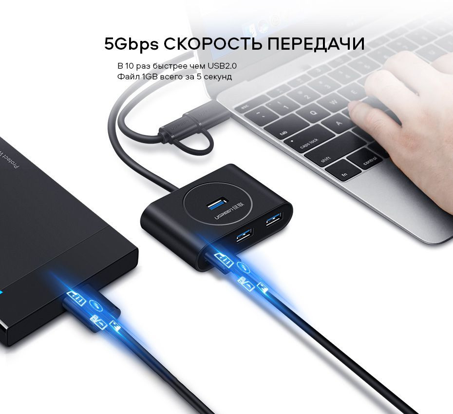 | Ugreen Разветвитель USB 3.0/Type C 4 port HUB CR113