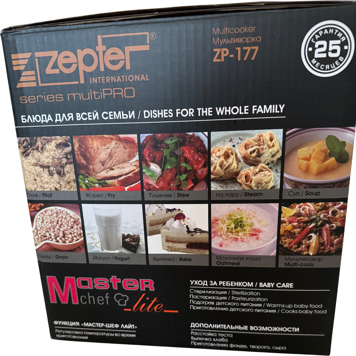 Zepter International Мультиварка ZP-177В данный момент этот товар отсутствует в продаже. Возможно, у нас найдется аналогичный или похожий товар здесь. Мультиварка Zepter ZP-177 идет в комплекте с принадлежностями для приготовления на пару, мерным стаканом, чашей, и ложкой для перемешивания. 12 программ, таймер и функция отложенного старта до 24 часов позволяют готовить широкую палитру блюд в любое удобное для Вас время. Вместительная чаша объемом 6 литра с антипригарным покрытием оптимальна для приготовления блюд для всей семьи. Модель Zepter ZP-177 имеет электронное управление, светодиодную подсветку дисплея, клапан для выпуска пара, равномерный нагрев, ёмкость для сбора конденсата. В этой мультиварке вы сможете приготовить рис (крупу), молочную кашу, суп, мясо, плов, выпечку, йогурт, и мн. др.; немаловажно также наличие программ: жарка, приготовление на пару, тушение, подогрев. Корпус мультиварки защищен пленкой. |