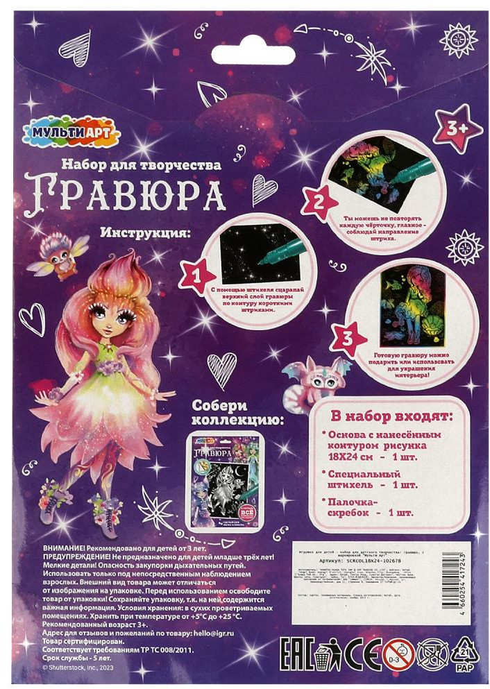 Multi Art Гравюра «Цветочные феи»В данный момент этот товар отсутствует в продаже. Возможно, у нас найдется аналогичный или похожий товар здесь. С помощью данного набора юный художник сможет создать эффектную картину на чёрном фоне. Контур рисунка уже нанесён на основу, остаётся только процарапать изображение специальным штихелем. Готовую поделку можно подарить близким или использовать для украшения интерьера. |