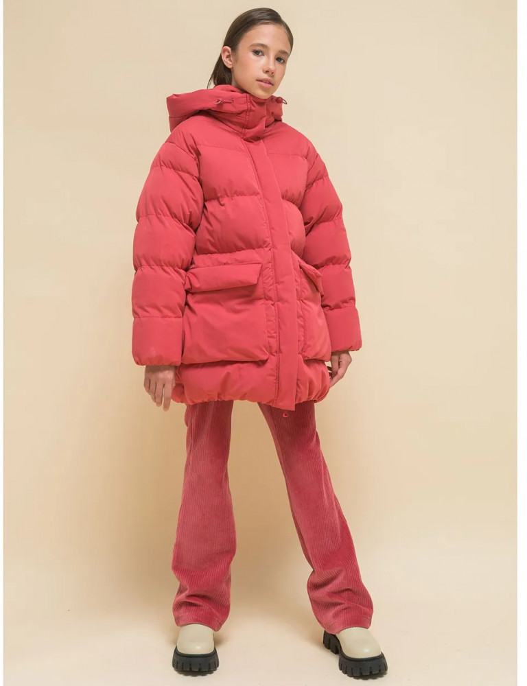 Куртка выполнена из полиэстера (+мембраны) — она тёплая, не промокает, легко стирается, быстро сохнет, сохраняет отличную форму и цвет надолго. Подкладка из мягкого, тёплого и дышащего флиса (по стану, внутреннему воротнику и в капюшоне). В рукавах подкладка из полиэстера — благодаря этому ребенку легко надевать куртку, руки не путаются в рукавах. Куртка выполнена в красном цвете. Её просто комбинировать с различными брюками, юбками, колготками. Куртка зимняя оверсайз идеальна для маленьких девочек дошкольного и младшего школьного возраста, а также девочек-подростков. Рекомендуемый температурный режим: не ниже минус 30 градусов. Утеплитель: экопух. В рукавах дополнительный слой тонкого синтепона. Модель подходит для носки в детский сад, школу, для прогулок и отдыха.