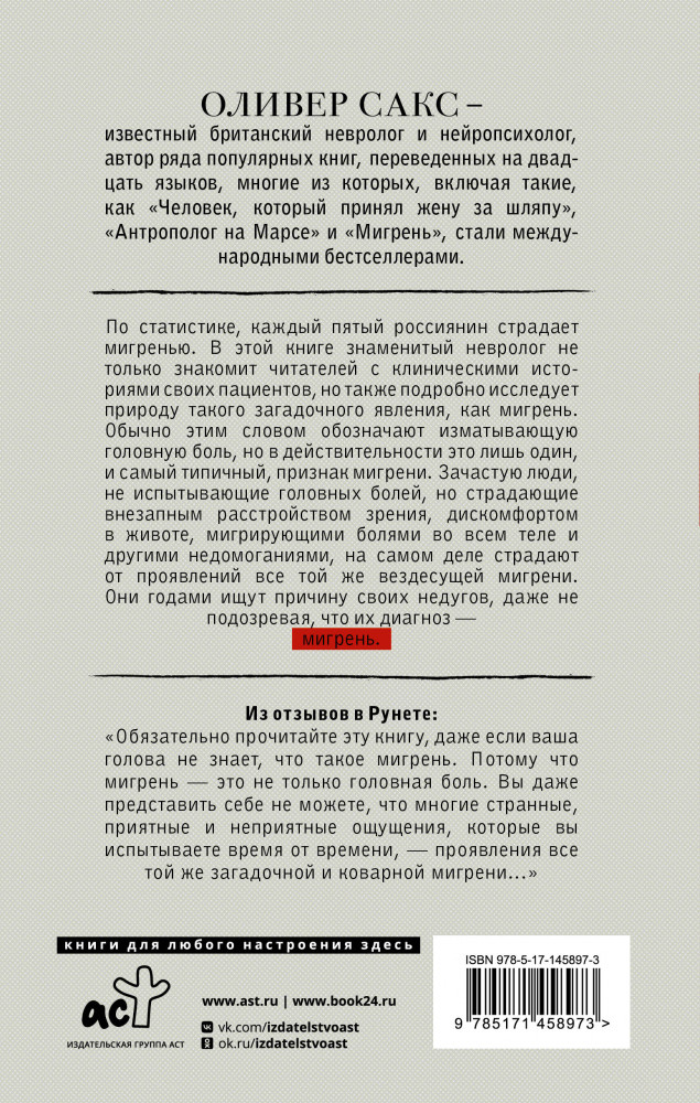 💳 Оплатить за товар можно при получении 🇰🇿 Есть бесплатная доставка по Казахстану от 1 дня 🎁 Копите бонусы с каждой покупки Серия: Расколотое «Я» «Мигрень» — сборник «клинических» рассказов Сакса, описывающих реальные истории его пациентов. Наибольший интерес в них представляют не сугубо медицинские подробности (которых в сборнике на удивление мало), а собственные переживания пациентов — и совершенно новая концепция восприятия многих психических заболеваний, позволяющих их носителям, неизлечимым в определенной области, неожиданно раскрыть себя и добиться немалых успехов в областях иных. |
