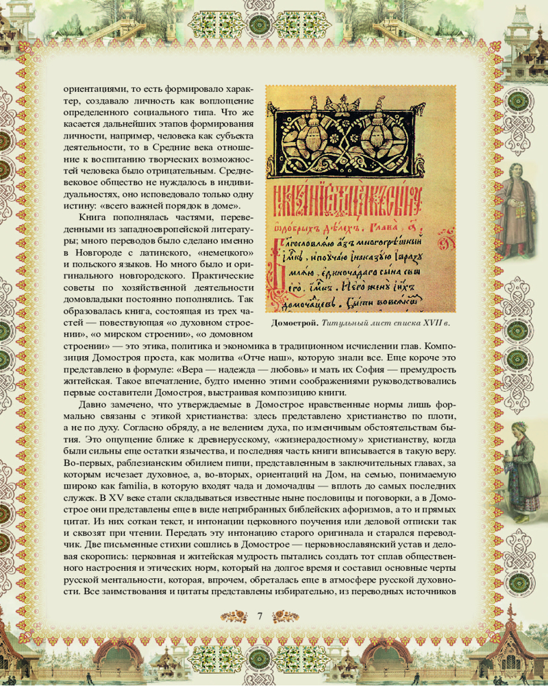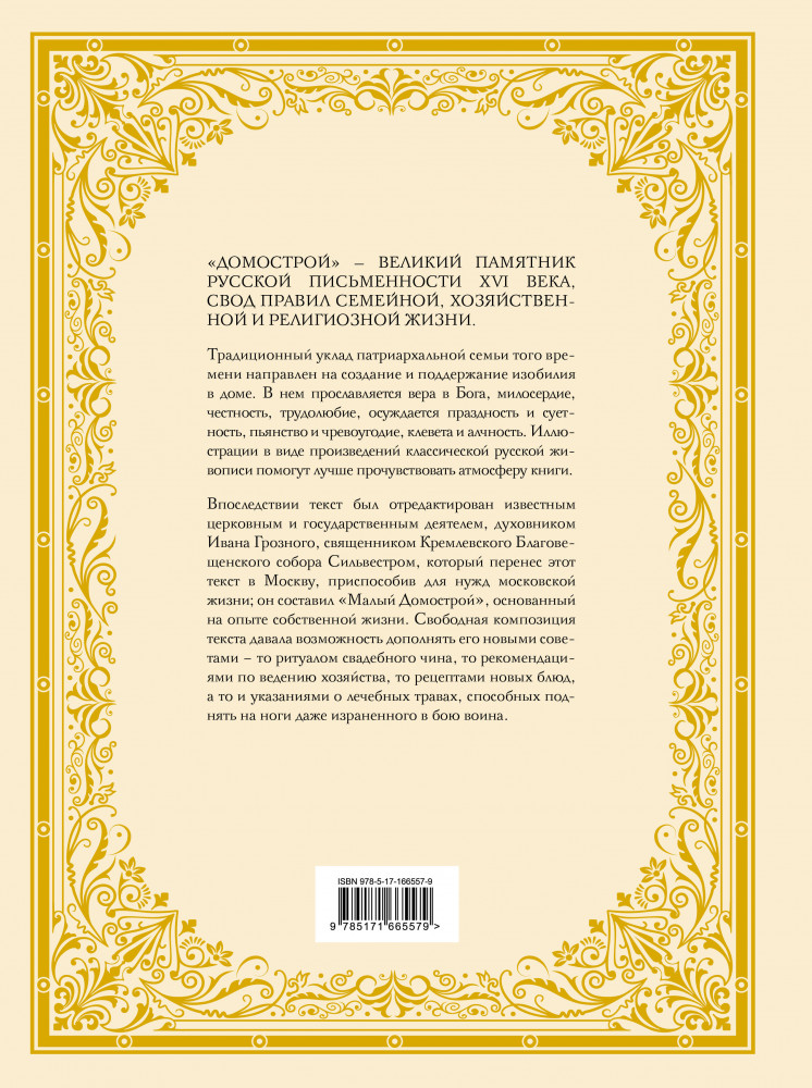 💳 Оплатить за товар можно при получении 🇰🇿 Есть бесплатная доставка по Казахстану от 1 дня 🎁 Копите бонусы с каждой покупки Серия: Большая подарочная книга «Домострой» — одно из самых значительных литературных произведений средневековой Руси. Собственно домострой как регламент семейной, хозяйственной и религиозной жизни складывался в Новгороде в XV веке. Это был переломный век русской жизни, именно в это время выковывалось современное русское мировоззрение, заложенное в генной памяти народа. Текст «Домостроя» — великий памятник русской письменности XVI века, своего рода энциклопедия семейной жизни, домашних обычаев, традиций русского народа. Практические советы по хозяйственной деятельности домовладыки постоянно пополнялись. Так образовалась книга, повествующая «о духовном строении», «о мирском строении», «о домовном строении». Композиция «Домостроя» проста, как молитва «Отче наш», которую знали все. Это уникальный свод уклада патриархальной семьи, направленный на достижение праведности, на укрепление семьи, на создание и поддержание изобилия в доме, повествующий о том, как детей воспитывать, как обнову справить, стол для гостя накрыть и убогого не обидеть. В нем прославлялись вера в Бога, милосердие, честность, трудолюбие, осуждению подвергались праздность и суетность, пьянство и объедание, клевета и алчность. |