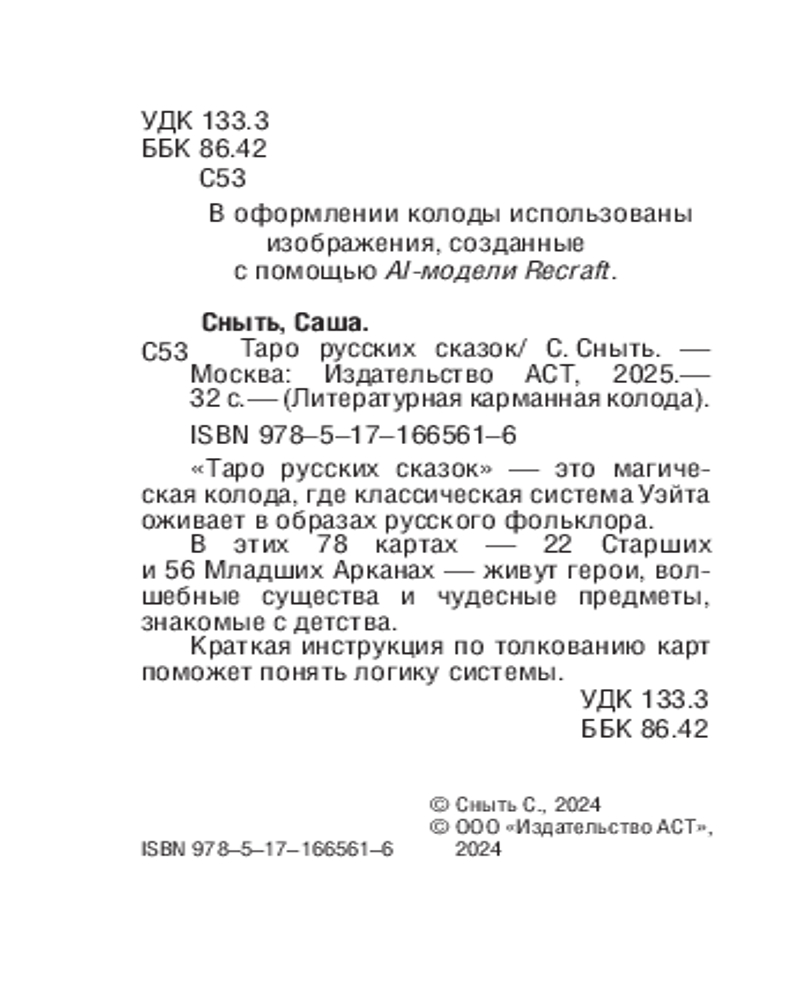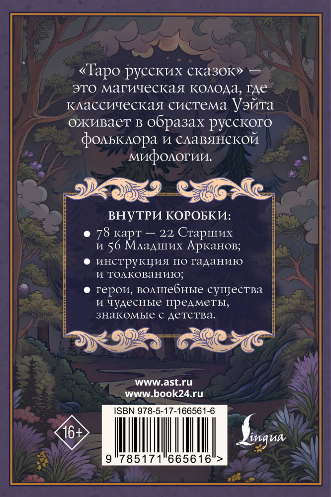 💳 Оплатить за товар можно при получении 🇰🇿 Есть бесплатная доставка по Казахстану от 1 дня 🎁 Копите бонусы с каждой покупки Серия: Литературная карманная колода «Таро русских сказок» — это магическая колода, где классическая система Уэйта оживает в образах русского фольклора и славянской мифологии. В этих 78 картах — 22 Старших и 56 Младших Арканах — живут герои, волшебные существа и чудесные предметы, знакомые с детства. Каждый Аркан здесь рассказывает свою историю и передает свою мудрость, предлагая интуитивное понимание через архетипы русских сказок. В этой колоде древние символы Таро переплетаются с духом народных преданий, создавая уникальное пространство для познания себя и мира. В коробке удобного карманного формата находится инструкция для гадания и толкования карт. |