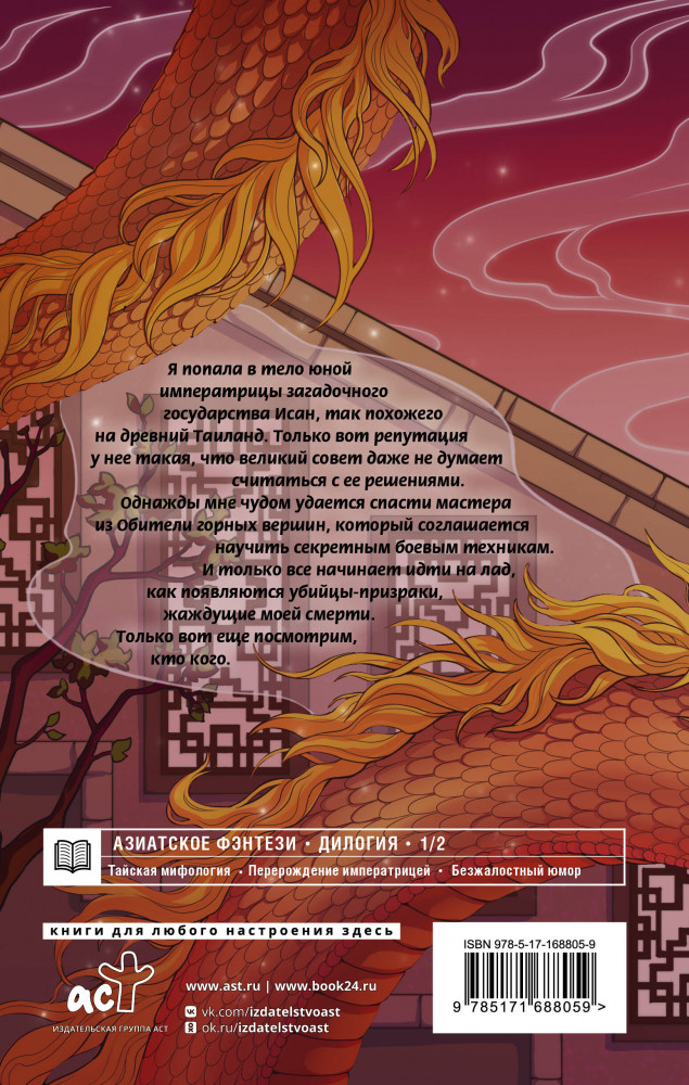 💳 Оплатить за товар можно при получении 🇰🇿 Есть бесплатная доставка по Казахстану от 1 дня 🎁 Копите бонусы с каждой покупки Серия: Магия Восходящего Солнца Я попала в тело юной императрицы загадочного государства Исан, так похожего на древний Таиланд. Только вот репутация у нее такая, что великий совет даже не думает считаться с ее решениями. Однажды мне чудом удается спасти мастера из Обители горных вершин, который соглашается научить секретным боевым техникам. И только все начинает идти на лад, как появляются убийцы-призраки, жаждущие моей смерти. Только вот еще посмотрим, кто кого. |