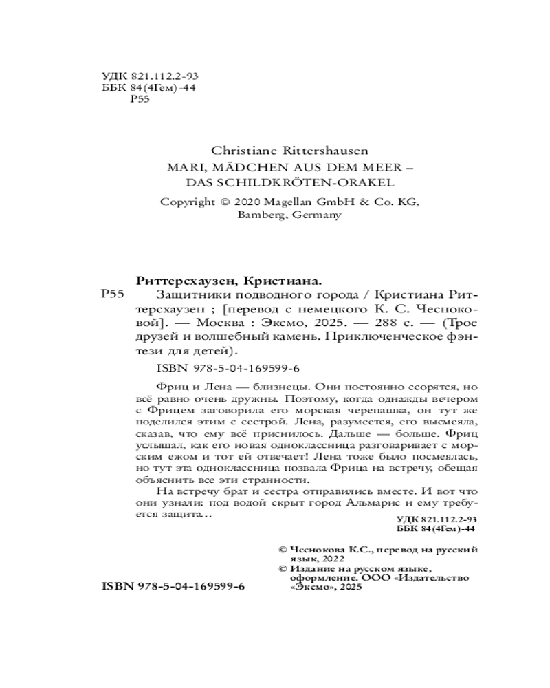 Серия: Трое друзей и волшебный камень. Приключенческое фэнтези для детей Первая часть увлекательной серии о приключениях под водой и над водой! Итак. На вашем побережье всё время суетятся искатели Атлантиды, а недалеко под волнами скрыт город Альмарис. Следует считать это совпадением? Близнецы Фриц и Лена не знали об Альмарисе до недавнего времени — пока в их классе не появилась новая девочка Мари, принцесса Альмариса под прикрытием. Отец отослал её, потому что их городу грозит опасность. Но Мари не намерена сидеть сложа руки, и новые друзья готовы ей помочь. |