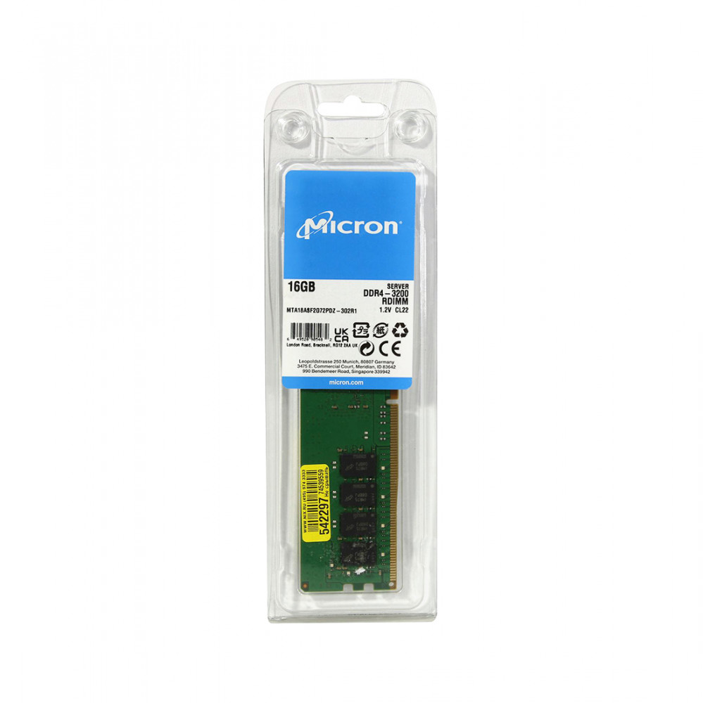 Эксплуатация планки Micron [MTA18ASF2G72PDZ-3G2R1T] возможна исключительно в серверных материнских платах или серверных платформах, совместимых с регистровой памятью. Модуль получает в общей сложности 16 чипов памяти, расположенных по обеим сторонам печатной платы. Он рассчитан на работу при входном напряжении на уровне 1.2 В.