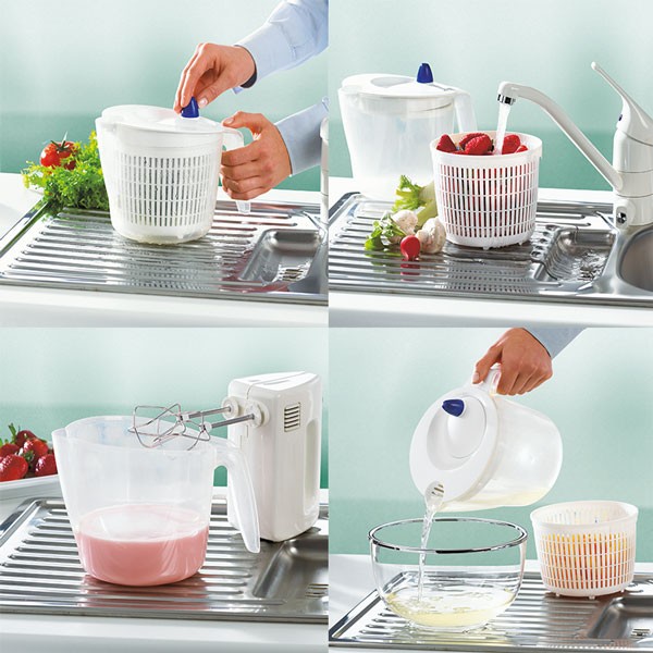 EMSA Сушилка для зелени (2л)В данный момент этот товар отсутствует в продаже. Возможно, у нас найдется аналогичный или похожий товар здесь. Сушилка для зелени - незаменимый помошник хозяйки в приготовлении салатов. Перед приготовлением салата зелень и овощи обязательно необходимо как следует промыть. Но после мытья на зелени остается влага - остатки воды, которая передает салату свой привкусвкус и препятствует связыванию растительного масла или соуса с зеленью. Сушка для зелени позволяет легко и просто решить эту проблему. Центрефуга для сушки зелени состоит из внешней миски, внутри которой размещен дуршлаг. Сверху эта миска накрыта крышкой со специальным вращательным механизмом. Все что необходимо сделать - это поместить вымытую зелень или овощи в дуршлаг сушилки и накрыть ее крышкой. Вам остается лишь потянуть за ручку расположенную на крышке - после чего запускается механизм центрифуги, раскручивающий дуршлаг и освобождающий зелень Вашего салата от остатков воды. |