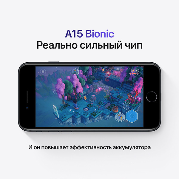 iPhone SE оснащён процессором A15 Bionic, разработанным Apple. A15 Bionic используется в iPhone 13, iPad Mini и iPhone 14. Частота процессора: 4 × 2.5 ГГц + 4 × 1.6 ГГц.