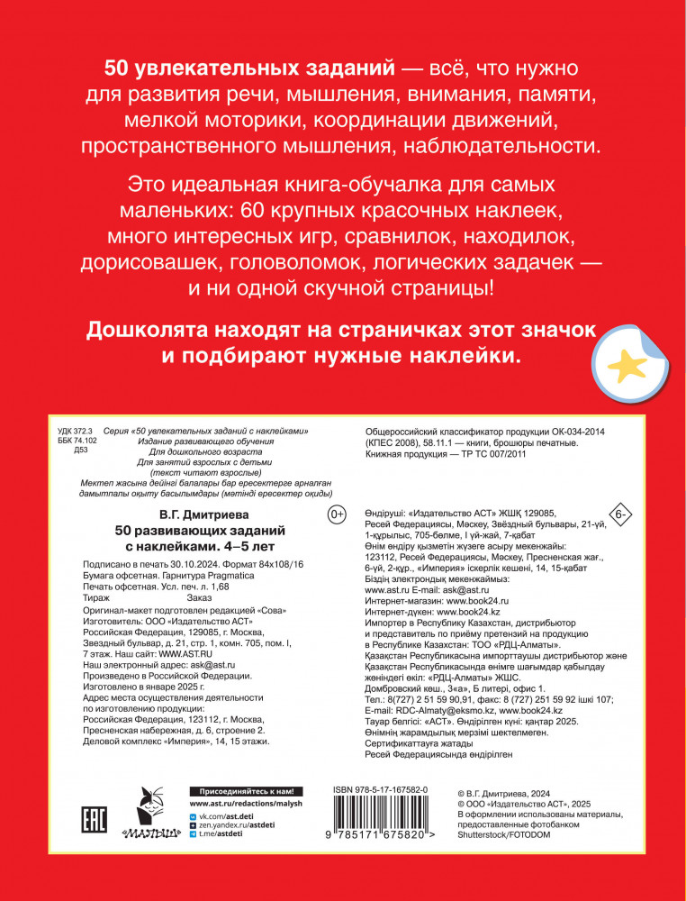 50 развивающих заданий с наклейками. 4-5 летВалентина Геннадьевна Дмитриева -20% +13