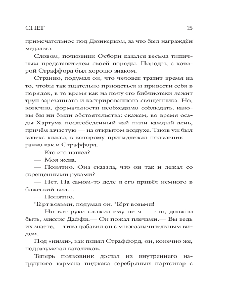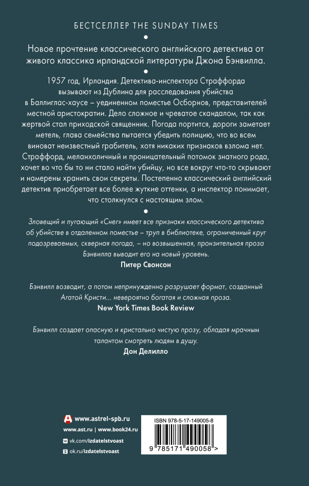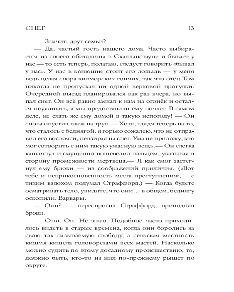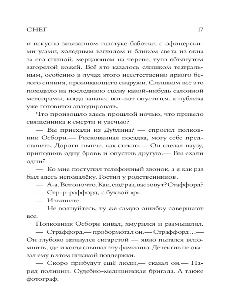 💳 Оплатить за товар можно при получении 🇰🇿 Есть бесплатная доставка по Казахстану от 1 дня 🎁 Копите бонусы с каждой покупки Серия: Великие мировые детективы 1957 год, Ирландия. Детектива-инспектора Страффорда вызывают из Дублина для расследования убийства в Баллиглас-хаусе — уединенном поместье Осборнов, представителей местной аристократии. Дело сложное и чреватое скандалом, так как жертвой стал приходской священник. Погода портится, дороги заметает метель, глава семейства пытается убедить полицию, что во всем виноват неизвестный грабитель, хотя никаких признаков взлома нет. Страффорд, меланхоличный и проницательный потомок знатного рода, хочет во что бы то ни стало найти убийцу, но все вокруг что-то скрывают и намерены хранить свои секреты. Постепенно классический английский детектив приобретает все более жуткие оттенки, а инспектор понимает, что столкнулся с настоящим злом. |