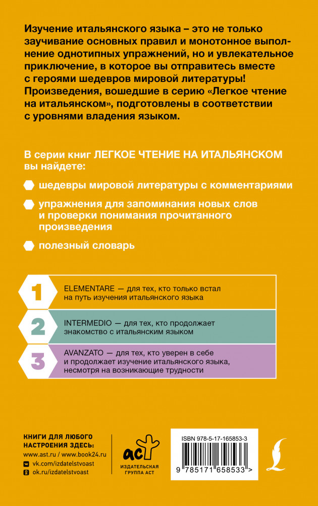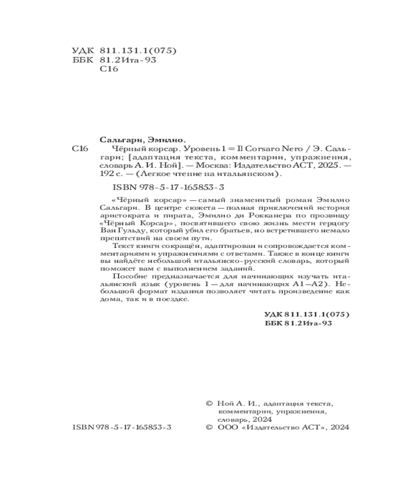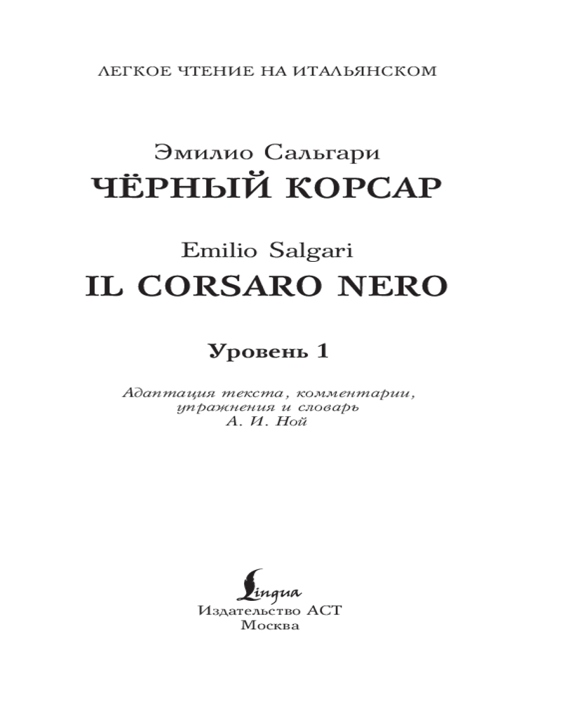 💳 Оплатить за товар можно при получении 🇰🇿 Есть бесплатная доставка по Казахстану от 1 дня 🎁 Копите бонусы с каждой покупки Серия: Легкое чтение на итальянском «Чёрный корсар» — самый знаменитый роман Эмилио Сальгари. В центре сюжета — полная приключений история аристократа и пирата, Эмилио ди Рокканера по прозвищу «Чёрный корсар», посвятившего свою жизнь мести герцогу Ван Гульду, который убил его братьев, но встретившего немало препятствий на своем пути. Текст книги сокращён, адаптирован и сопровождается комментариями и упражнениями с ответами. Также в конце книги вы найдёте небольшой итальянско-русский словарь, который поможет вам с выполнением заданий. Пособие предназначается для начинающих изучать итальянский язык (уровень 1 — для начинающих А1—А2). небольшой формат издания позволяет читать произведение как дома, так и в поездке. |